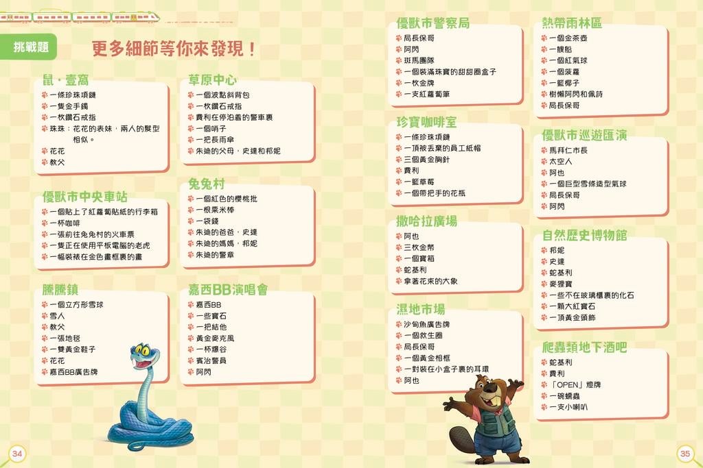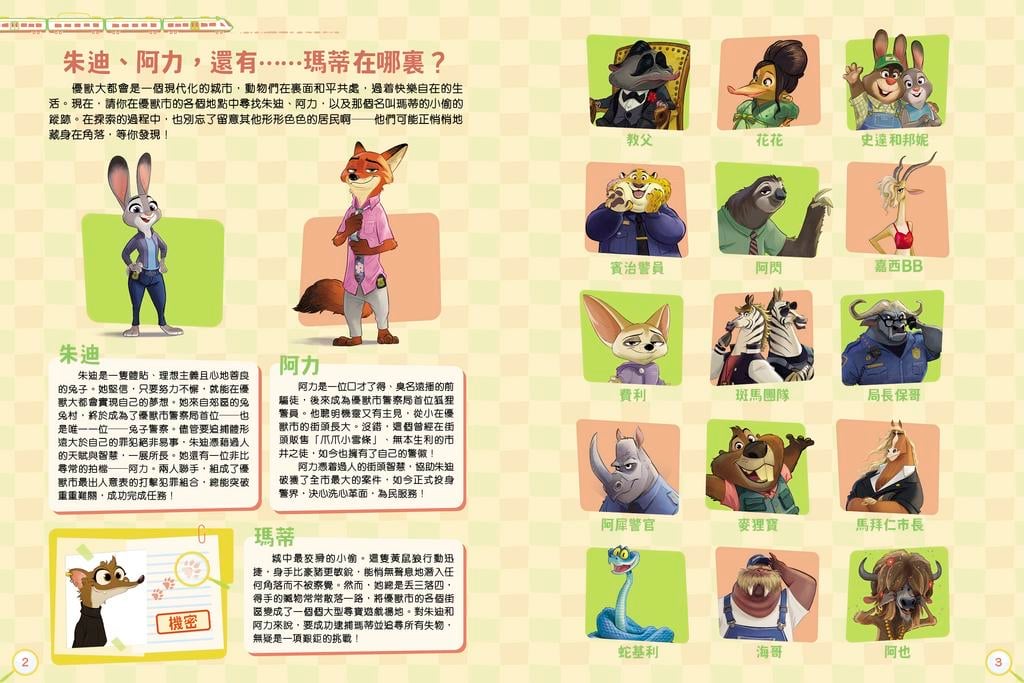 📚全書包含14個精彩場景,一起探索新領域‼️ 🌈本書收錄了《優獸大都會》及《優獸大都會2》電影🎬的精彩場景,以找找看遊戲形式結合了場景插圖與角色搜尋,讓讀者可以經典重溫,挑戰觀察力。 ❤️除了每個跨頁的找找看任務外,更附挑戰題,增加任務數量和提升難度,更加耐玩。 朱迪與阿力在哪裏?🤔 快來跟朱迪與阿力一起在優獸大都會的不同地方追蹤罪犯,打擊罪案!😎從到繁華熱鬧的車站到探索未知的新社區這兩位警員的身影藏在城市的每個角落一一你能一一找出他們嗎? 📚本書精選《優獸大都會》電影中最精彩、最熱鬧的場景,挑戰你的觀察力與專注力!場景越熱鬧,搜索的難度越高!請你找出朱迪和阿力這對好拍檔,然後幫助他們追捕狡猾的罪犯。書中還有更多驚喜細節等你來發現!