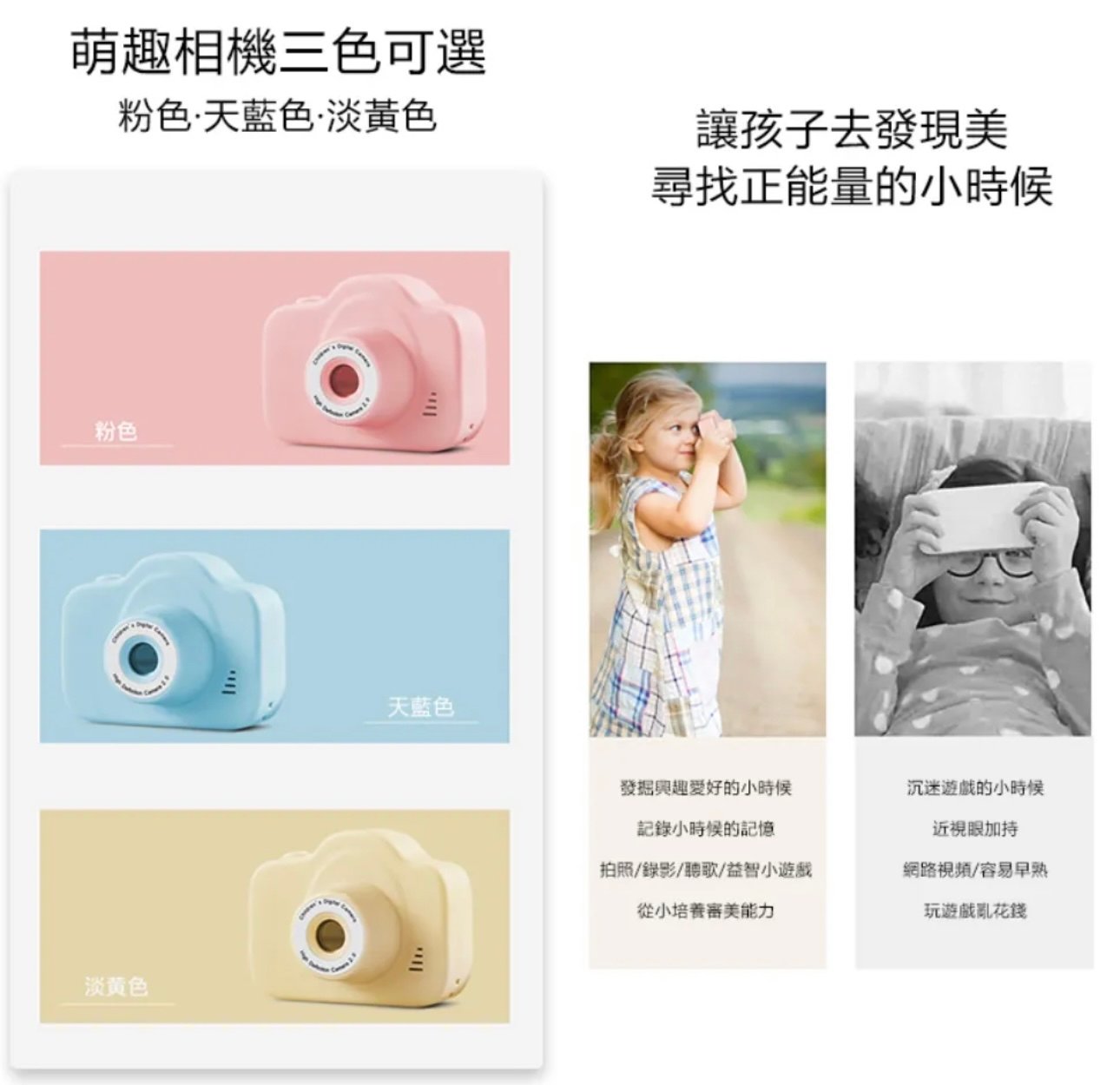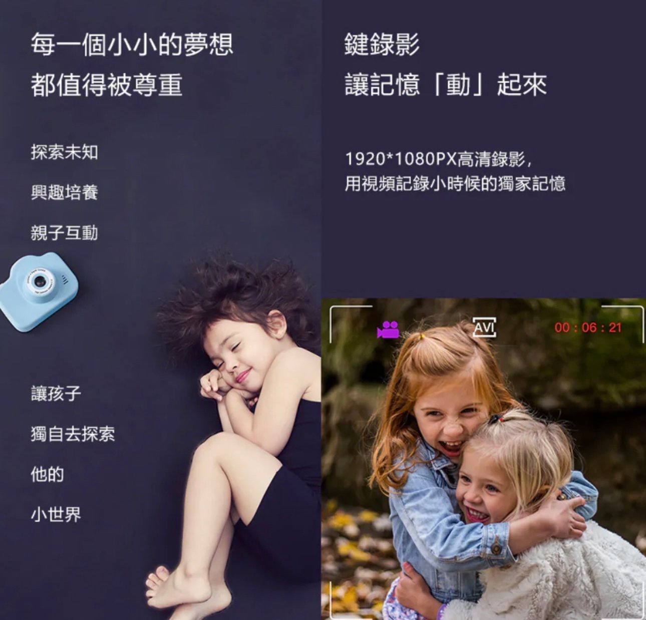 #👍最新升級版本 #雙攝2000W📸 超強功能一次擁有 🖼️ 智能對焦拍攝,DIY趣味相框🗣️ 內置多種卡通相框💡精彩照片花樣展現 錄影功能小小導演的從小培養起! 能拍照能唱歌💪可播放音樂 還有益智小遊戲 😄沒有插記憶卡內建可拍幾十張👀(僅能在相機觀看無法輸出) ✅拍照 錄影 自拍 小遊戲 音樂多有📷 相機是充電的 插入記憶卡就可以存照片了 因為小朋友都一頓按幾百張照片💯不是問題 相機很輕不用擔心小朋友掛脖子會累 💗產品特點 2000W像素 1080P高清錄像 MP3音樂播放 自拍錄像 益智小遊戲 大頭貼 多種濾鏡 4層光學玻璃 超大感光芯片 畫質出彩清晰 AI智能拍照技術 自動對焦調色 2.2寸IPS螢幕護眼 400MAH持久續航 📋產品信息 ⏩尺寸:8*6cm ⏩螢幕大小:2英寸 ⏩適用年齡:3歲以上 ⏩充電時間:約2小時 ⏩產品功能:拍照、錄影、大頭貼
