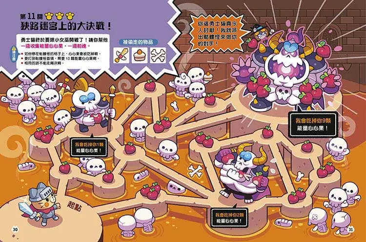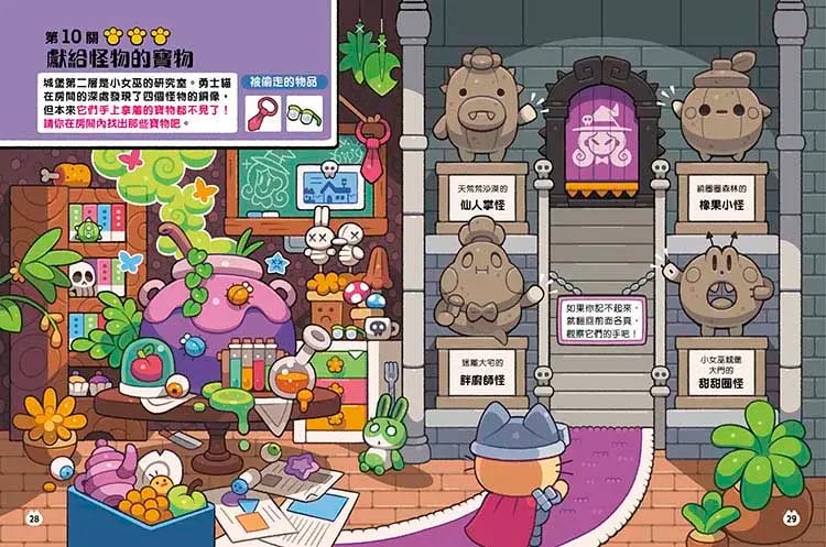 由喵喵王國出發到小女巫城堡之間危機處處,中間還有1 2個智慧關卡,包括迷宮、找不同、找找看、計算、文字圖片推理等,你可以幫助勇士貓突破各種考驗,拯救喵喵王國嗎?