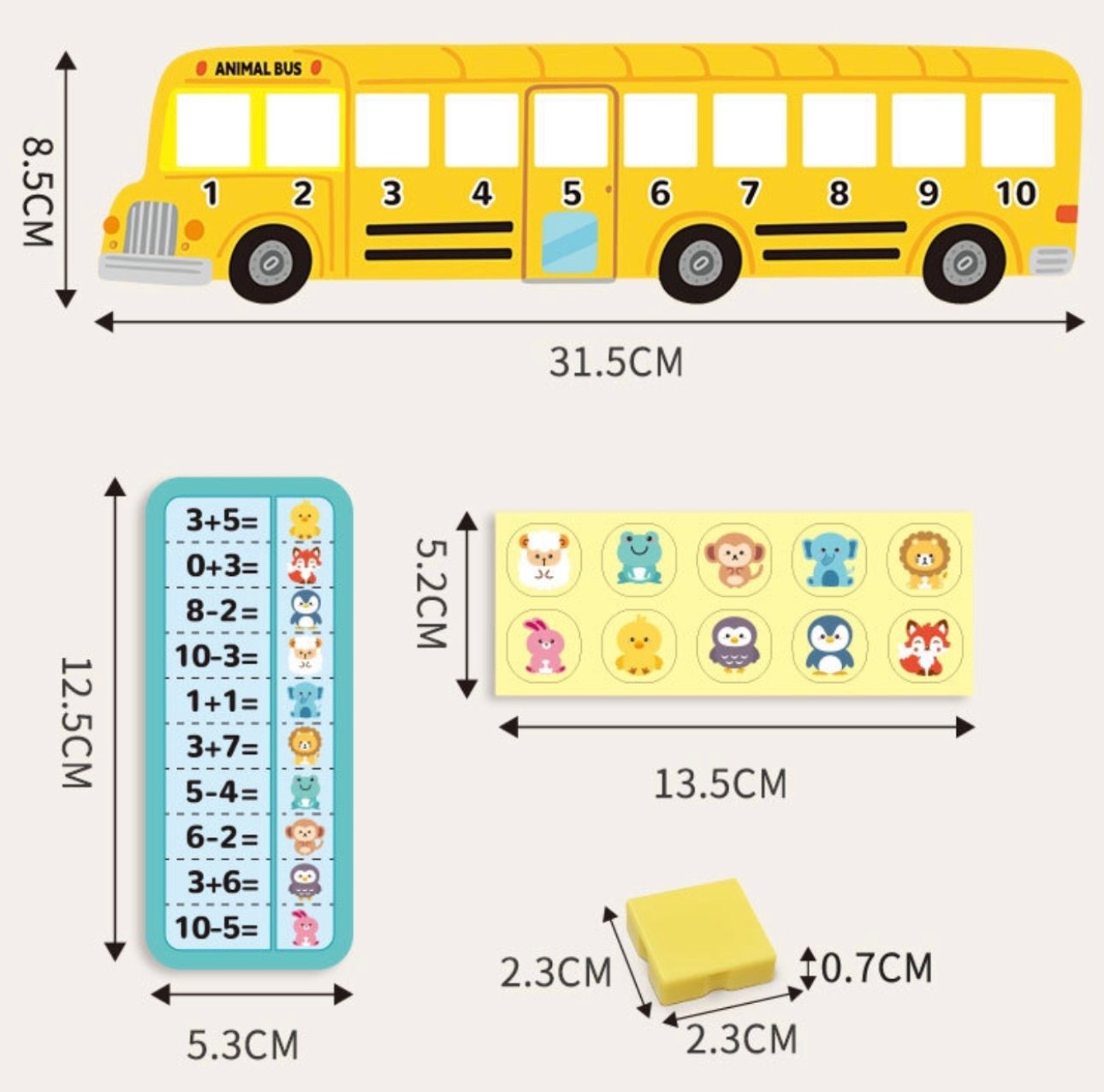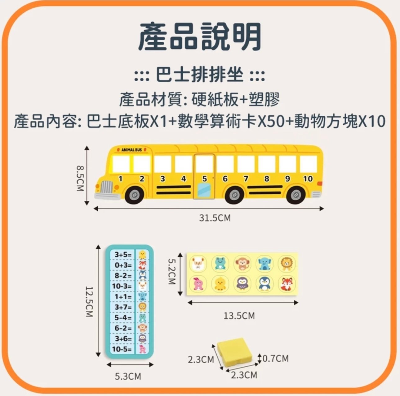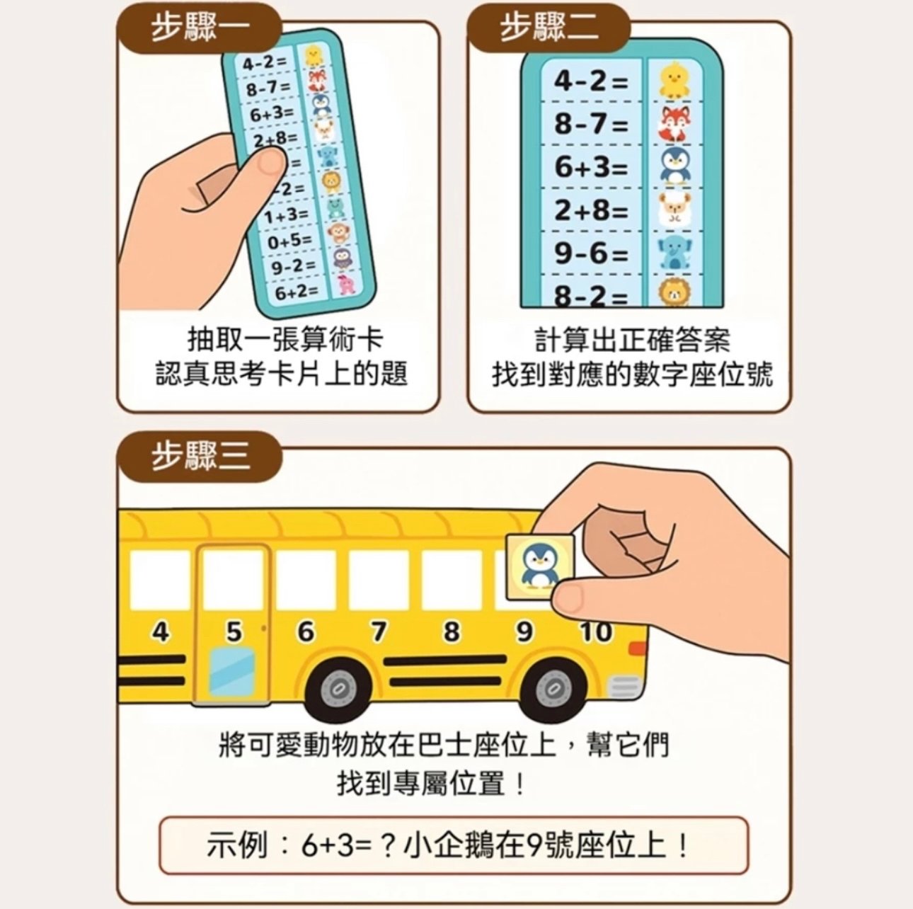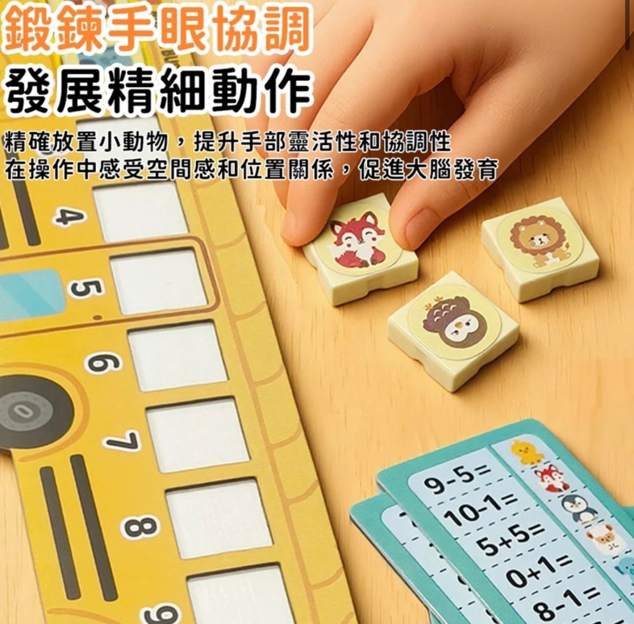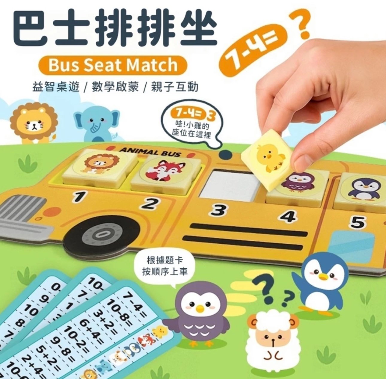 動物巴士排排數學桌遊 🔢數學啟蒙桌遊,專為3-6歲寶貝設計! 🦁 底板+50張題卡+10動物方塊 依算式「7-4=3」把動物排進對應座位 邊玩邊學加減法、邏輯排序👋 🐘 色彩鮮豔、安全無毒,培養觀察力&專注力 進階挑戰不無聊🌟熱賣蒙特梭利教具 陪孩子開心搭公車,數學變簡單! 快來讓小雞、小鴨上車啦~🚍
