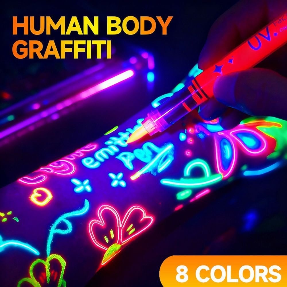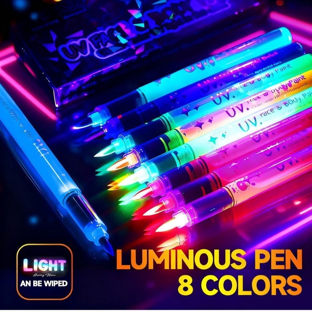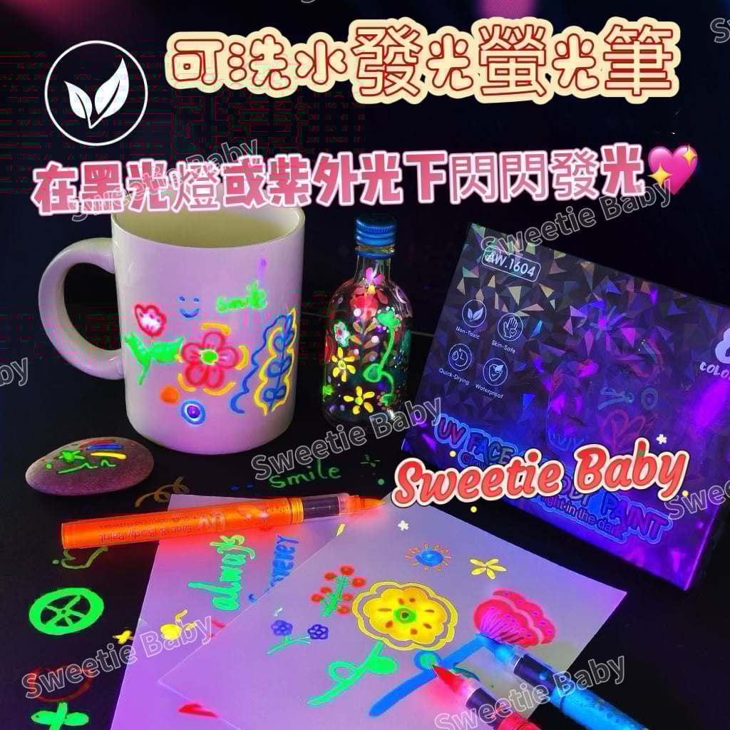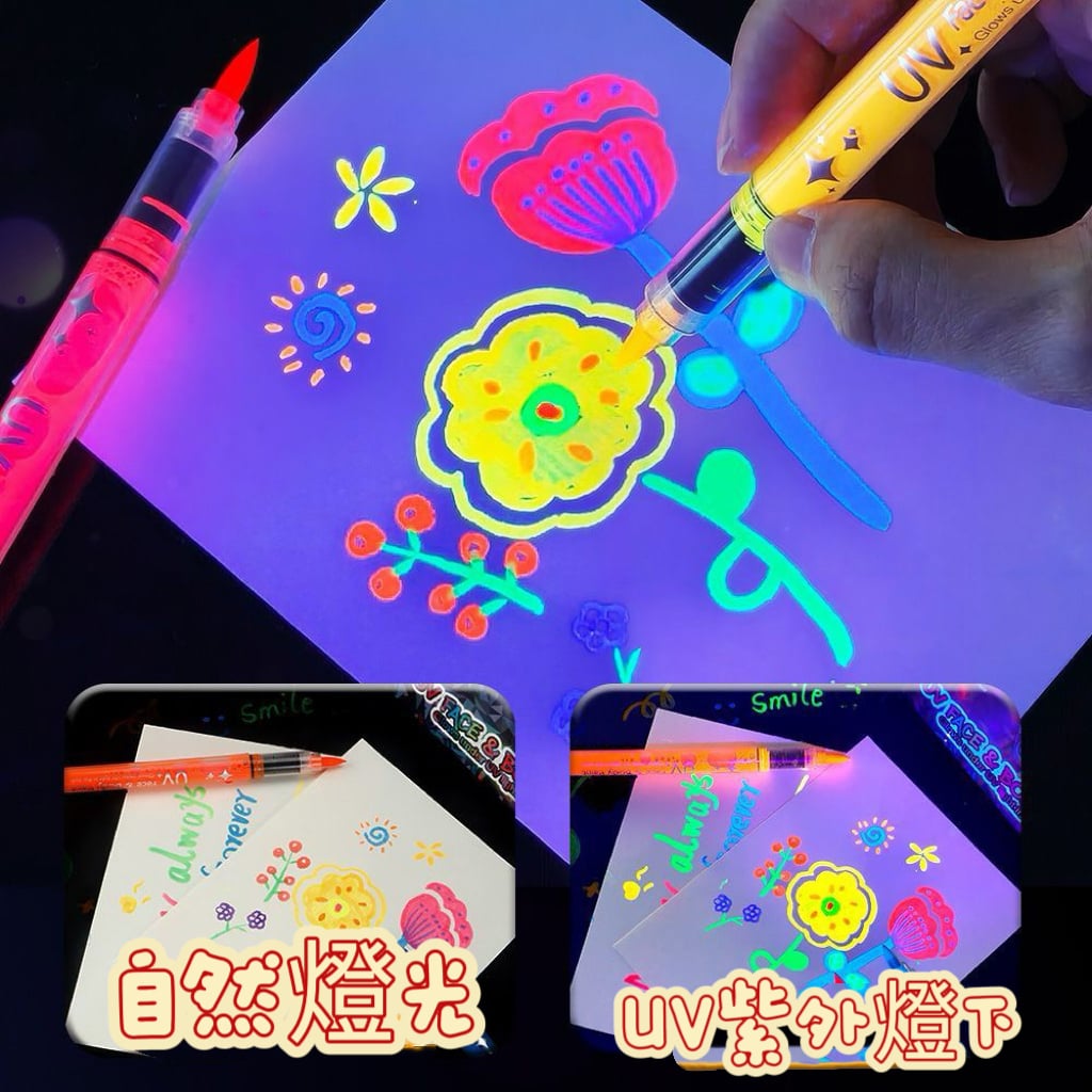 紫外光下發光🌟螢光顏料筆能讓在黑光燈或紫外光下閃閃發光✨呈現出明亮鮮豔的色彩‼️ 打造吸睛效果😍注意:使用前請用紙巾吸去少量顏料,以免筆尖滲出過多顏料🫶🏻 ⚠️使用技巧: ●使用前請充分搖勻,以免墨水過稀。 ●塗抹前,請用紙巾吸去多餘墨水。 ●待墨水完全乾透後再疊加塗抹,可獲得更鮮豔的色彩。 ●每次使用後請務必蓋上筆蓋。 ●如果墨水乾枯:蓋上筆蓋並用力搖晃(像搖晃溫度計一樣),即可恢復墨水流動。