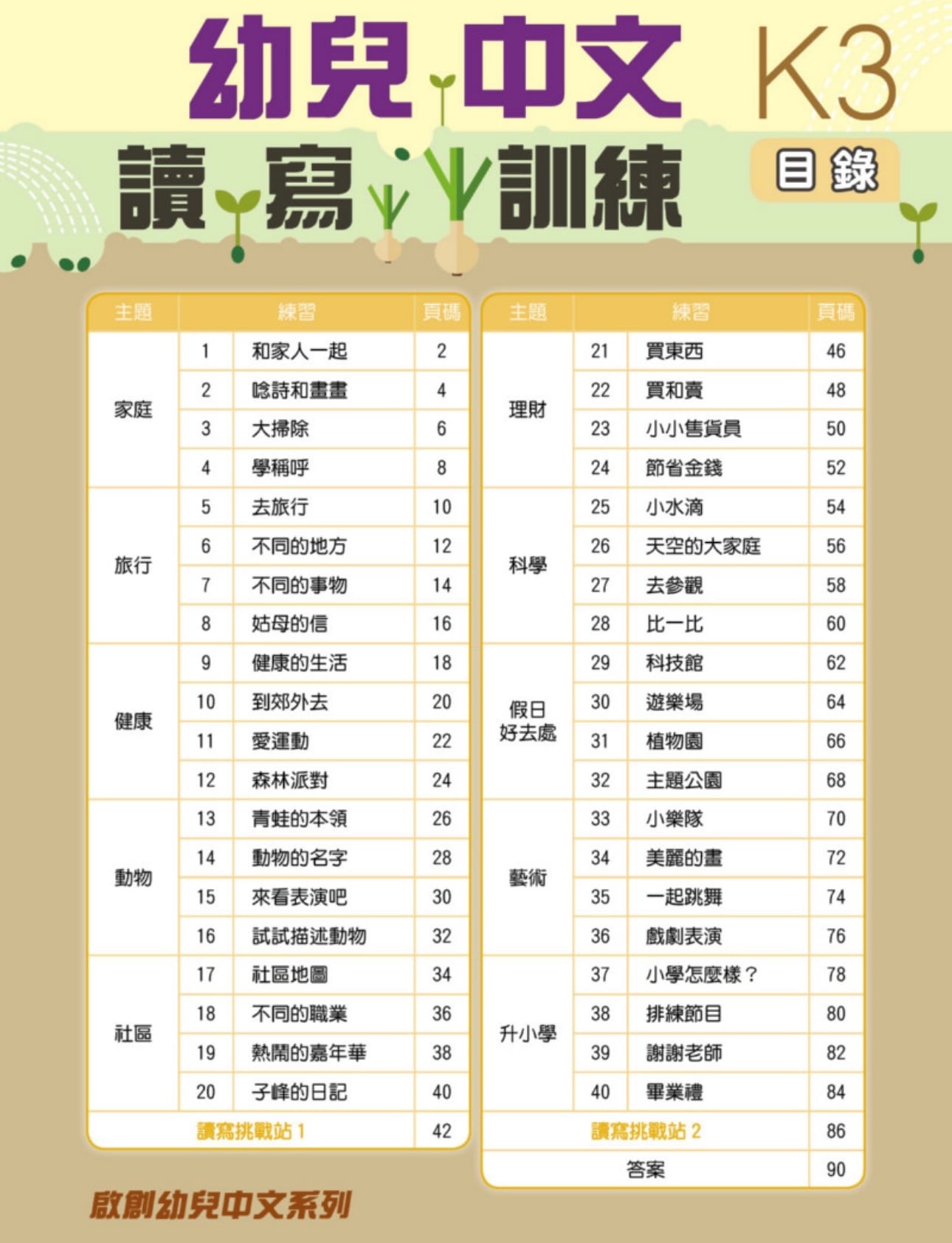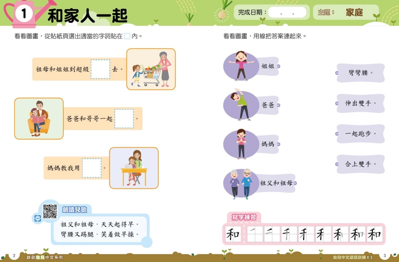 幫助幼兒同步地加強閱讀能力🗣️及寫字能力✍🏻 • 閱讀訓練以二維碼QR code💬 提供「廣東話」和「普通話」的語音示範,內容包括句子、兒歌及短文,引導幼兒樂於朗讀,從而提升閱讀能力及興趣👍 • 寫字訓練配合幼兒的發展特徵而設計,幼兒可透過: K1 寫前練習 → 連線活動 → 鍛煉運筆能力 K2 筆畫練習 → 基本筆畫 → 了解構字元素 K3 寫字練習 → 筆畫順序 → 掌握寫字技巧 • 活動形式多元化,除選擇、連線〰️、填色🖍️等基礎題型外,更有迷宮、猜謎及情境題📒 • 設有不同階段的讀寫挑戰站,總結並深化