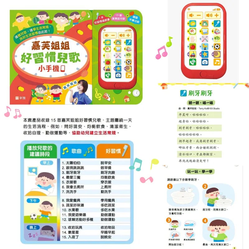 👩🏻收錄15首嘉芙姐姐好習慣兒歌📱🎵🎶 協助幼兒建立生活常規😉 作為父母,我們最希望孩子能夠 健康快樂地成長,但每天提醒洗手、收拾、早睡早起……講幾遍都沒用?現在有了 **嘉芙姐姐好習慣兒歌小手機,育兒變得輕鬆又有趣! 👧👦 專為幼兒設計的 15首好習慣兒歌,一天生活流程全涵蓋: ☀️ 早晨問好,精神滿滿出發! 🥗 均衡飲食,愛上蔬果不挑食! 🧼 清潔衛生,主動洗手刷牙好乖乖! 🧺 收拾自理,玩具自己收最有成就感! 🌙 早睡早起,建立規律作息超重要! 🏃 勤做運動,活動四肢健康又開心! 🎵 邊聽邊學,潛移默化建立生活好習慣! 📘 搭配互動遊戲書,孩子不只能聽歌,還能動手做, 學習 × 遊戲 × 親子互動 一次搞定! 📌 孩子愛不釋手,爸媽也終於可以輕鬆一下!」 📌 啟發孩子自主能力的好工具! 💡 全新登場的兒歌小手機,不只是玩具,是育兒神器! 快來體驗嘉芙姐姐的魔法,讓孩子天天主動做好習慣 ❤️