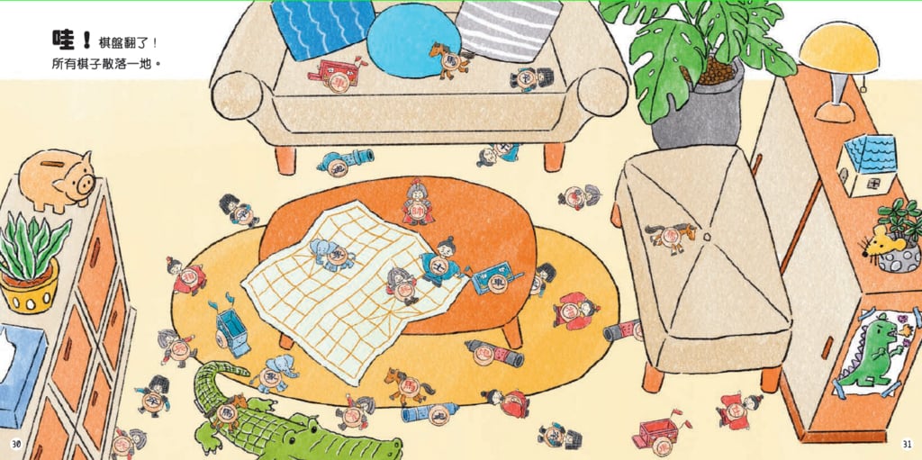 ❤️學會團隊合作:即使曾是對手,也能攜手解決困難。 理解勝敗的意義:輸贏不重要,擁有體育精神才是真正的智慧。 認識象棋文化:從趣味對戰中,感受中華棋藝的巧妙與魅力! 在中華文化的長河中,有許多看似平凡的小物品,卻承載著深厚的歷史、情感與智慧。它們陪伴着我們的日常生活,見證着家族的歡聚、節慶的喜悅、文化的傳承。《小物品•大中華》系列繪本,以孩子熟悉的日常物品為主角,透過生動有趣的故事,帶領小朋友探索這些小物件背後的文化意義。 在棋盤的戰場上,紅黑兩軍嚴陣以待!紅蓬主帥沉穩指揮,黑袍將軍卻急躁冒進,一場激烈的中國象棋對戰就此展開。當黑袍將軍因連連失利大發脾氣,甚至掀翻棋盤時,所有的棋子散落一地…⋯ 令人意外的是,紅棋並沒有趁機慶祝勝利,而是選擇伸出援手,帶領黑棋一起尋找失蹤的黑袍將軍。黑袍將軍到底在哪呢? 最終,棋子們發現—原來棋盤上的「戰爭」只是遊戲,而一盤完整的棋,缺了誰都不行!