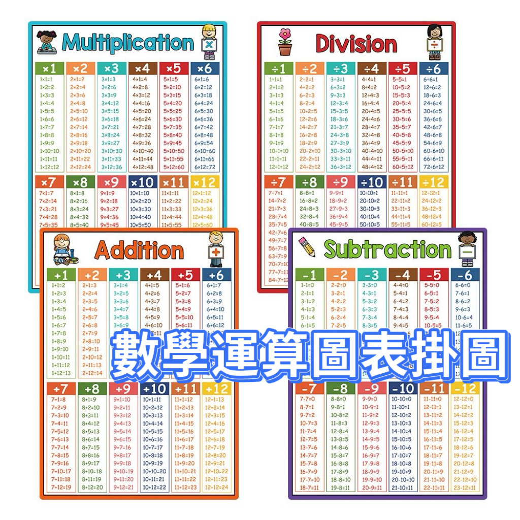 包括✖️乘法➗除法➕加法➖減法運算表的數學學習掛圖💁🏻♀️ 海報涵蓋了從1到12的乘法、除法、加法和減法運算🧮