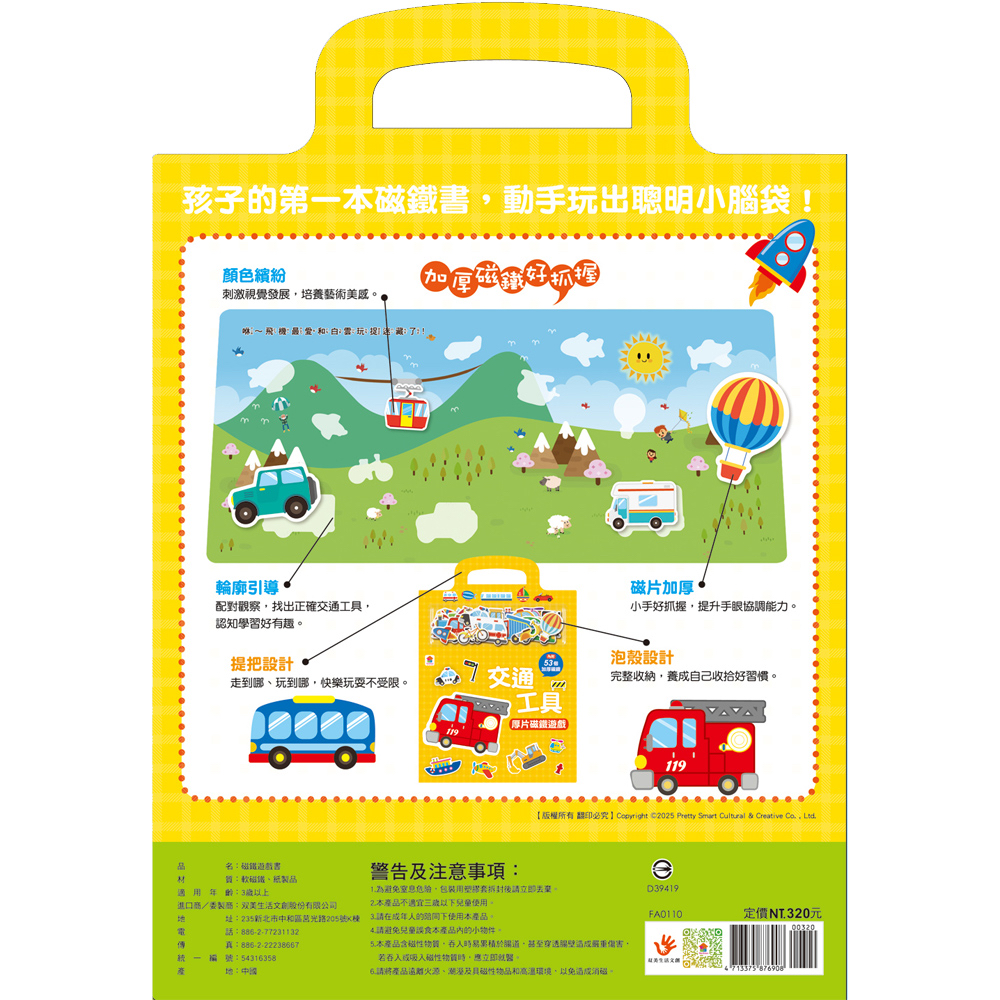 孩子的第一本磁鐵書🧲動手玩出聰明小腦袋! 🤗提把設計,走到哪,玩到哪。 53個加厚🧲磁鐵,小手好抓握, 搭配遊戲場景,在遊戲中學習! 挖土機、警車🚓、垃圾車…… 你認識的交通工具有哪些呢? 在遊戲中一起認識他們吧! 邊學邊玩真有趣‼️ ❤️貼心泡殼設計,完整收納好方便,養成孩子自己收拾好習慣。 ✨本書特色✨ ✅加厚磁鐵:小手好拿取,提升手眼協調能力。 ✅認知啟蒙:圖像認知,加深記憶,輕鬆認識交通工具。 ✅輪廓引導:配對觀察,找出正確圖案磁鐵,認知學習好有趣。 ✅提把設計:走到那玩到那,快樂玩耍不受限。 ✅泡殼設計:完整收納,養成自己收拾好習慣。 ✅顏色繽紛:刺激視覺發展,培養藝術美感。