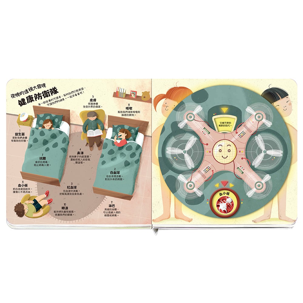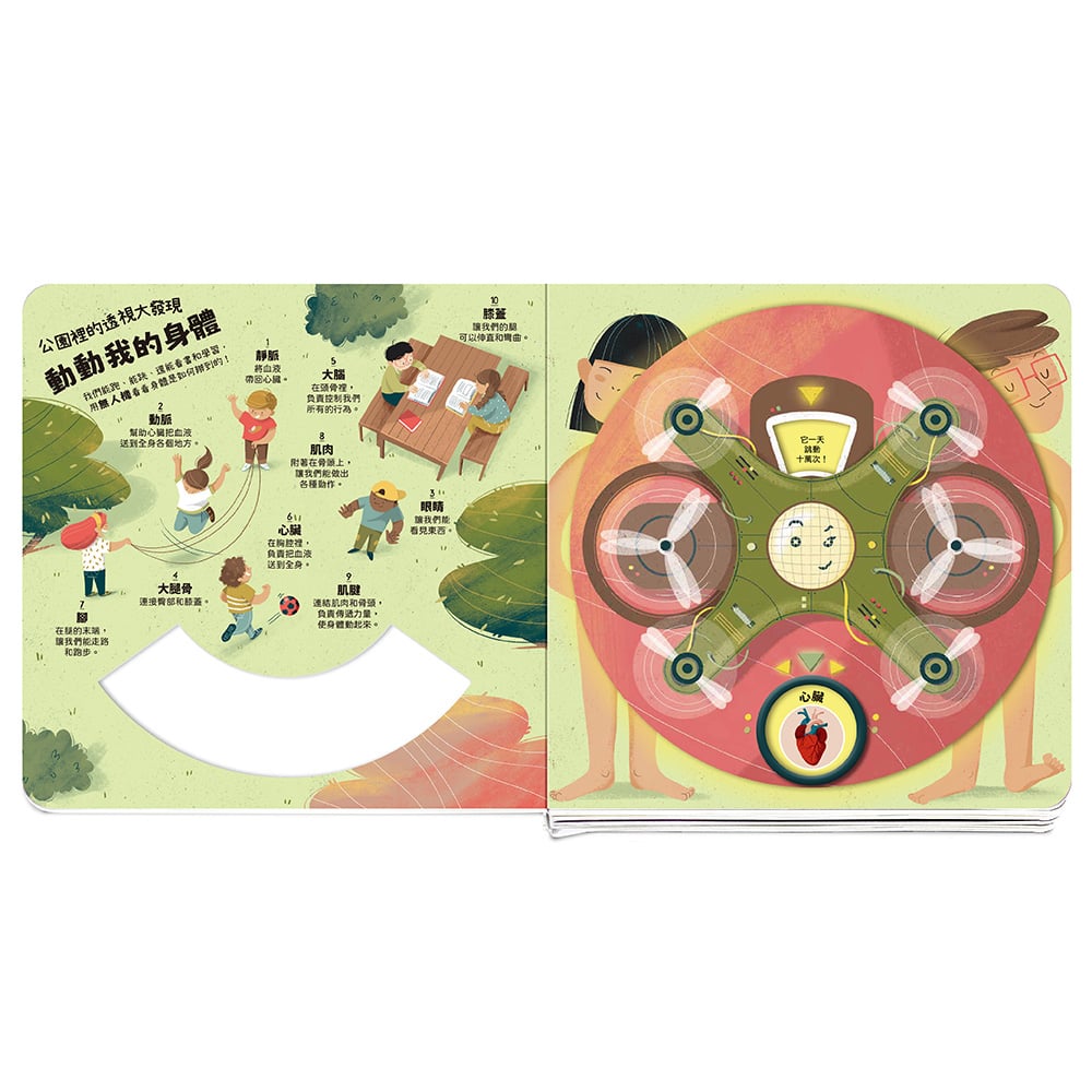 ☀️開啟孩子觀察力與知識力的冒險之旅💁🏻♀️ 🎉轉動無人機,探索神祕的人體世界,發現不一樣的驚喜🎉 孩子從畫面中觀察身體構造🫁的細節,再轉動無人機,找出對應的器官或系統。 搭配淺顯易懂的圖文解說,認識人體的運作方式與器官的神奇功能。 👀觀察×操作×知識,三重學習玩法👀 從人體構造開始,幫助孩子了解人體的組成,再透過操作旋轉機關找出對應的器官,提升手眼協調。最後搭配淺顯有趣的知識,培養科學探索與自我認知。 ❤️無人機視角探索,看見世界的新樣貌 以趣味的無人機視角,讓孩子模擬從空中俯瞰整個環境,不僅激發好奇心與參與感,更強化了視覺搜尋與空間想像的能力。 🌈畫面細節豐富,彷彿身歷其境 風格鮮明、色彩飽滿的插圖,極具真實感與童趣感,不但吸引目光,更能激發觀察與好奇心。