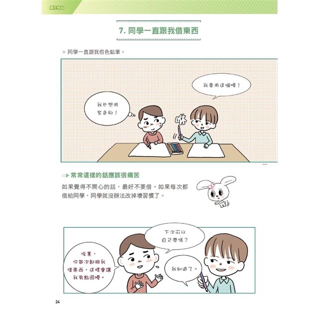 ★★★★★本書榮獲114年「文化部中小學生優良課外讀物推介」★★★★★ 小學生的同學相處寶典 專為小學生設計的溝通與社交指南 在學校的人際關係超級實用書 ‧暢銷近10萬冊,韓國眾多小學生人手一本 ‧長占各大網路書店排行榜,家長好評不斷 ‧漫畫式情境,閱讀好輕鬆 如何與同學相處?如何表達想法? 當小孩進到小學之後, 就會開始面臨許多跟同學相處的問題。 即使是成年人,有時也很難面對這樣的人際關係。 國小是一個小型的社會, 也是孩子學習面對人際關係的第一堂課。 這在學校的課程中不會學到,但卻很重要, 他們在學校可能會遇到: 同學一直跟我借東西、擅自拿走我的東西、 東西不見了卻懷疑我、怪我害他輸了比賽、 因為小事而生氣、不遵守遊戲規則、 要其他人不要跟我玩…等眾多情況, 甚至是被霸凌的狀況。 透過實際調查與作者在小學教學現場的實務經驗, 書中彙整出62個小學生常見的人際關係問題與煩惱, 並提供應對的方法。 希望讓孩子在學校遇到各種來自同學的困擾時, 都可以有具體的參考資訊。 幫助孩子學習表達自己的想法與心情, 懂得如何處理問題,更能掌握人際關係, 累積成功的社交經驗,讓小學的生活更自信與自在。 每個主題約1~2頁的篇幅,以漫畫式情境呈現, 搭配男、女孩都通用的畫風,讓孩子更願意閱讀, 也容易理解。