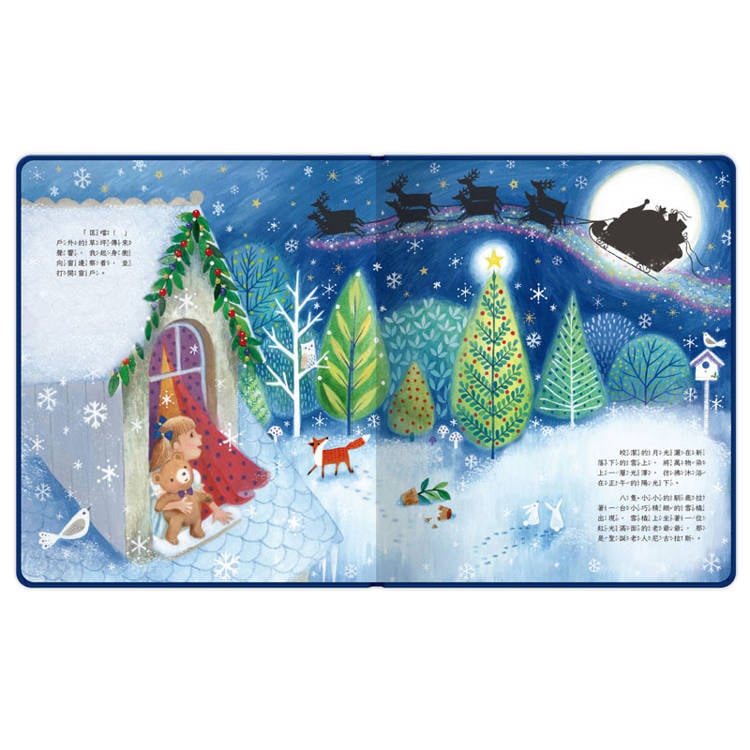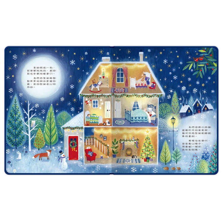 聖誕節前一晚, 孩子們在壁爐旁掛上聖誕襪, 期待聖誕老人會送來什麼禮物…… 聖誕老人怎麼送禮物?他的馴鹿們叫做什麼名字呢? 改編自兩百年前的經典聖誕詩《A Visit from St. Nicholas》, 在星光閃耀的奇幻聖誕夜深入了解聖誕老人的工作內容, 並揭開馴鹿送禮小隊的神秘面紗! 本書特色 ◆經典詩作改編,紅鼻子魯道夫和他的夥伴們 提到聖誕節,相信很多人都記得有著閃亮的紅鼻子的馴鹿——魯道夫。 不過,你知道魯道夫還有許多夥伴嗎?他們每一位都有名字,會一起幫聖誕老人送禮物、出任務,而這些馴鹿的名字,就是從這裡來的喔! 改編自美國詩人Clement Clarke Moore的詩作《A Visit from St. Nicholas》, 把經典的聖誕老人與馴鹿的傳說,透過精美的插圖與床邊故事般的文字呈現給讀者。 讀完這本書,認識聖誕老人以及每一隻馴鹿吧! ◆華麗立體摺頁,呈現經典場面 書內附上一頁精緻的立體紙雕,展現聖誕老人送禮物的經典場面。繪圖細緻、色彩豐富,將充滿想像力的文字描繪的夢幻畫面具體呈現在眼前,擺在桌上、床頭櫃也可以成為日常生活中美麗的裝飾。 ◆配備注音,孩童閱讀好輕鬆 本書內文附注音,不只適合親子共讀,孩童也可自行享受閱讀的樂趣。 ◆QR Code一掃,睡前故事好好聽 書內附QR Code,掃一下就能聆聽故事音檔。睡前或是休息時光隨手一放,就能悠閒享受美好的故事。
