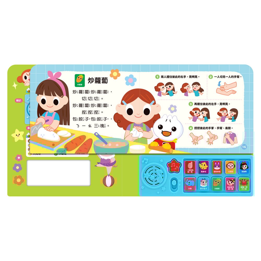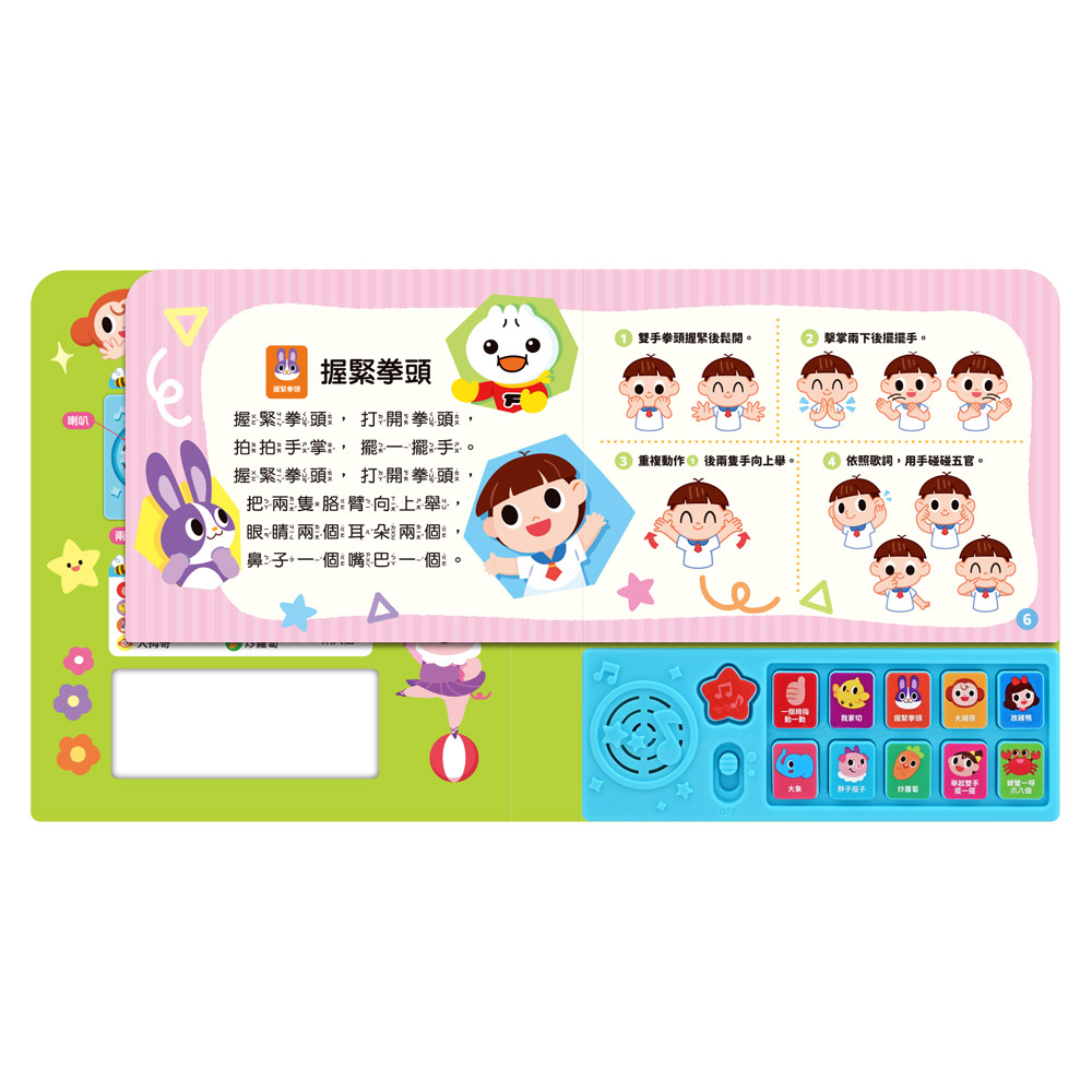 10首手指律動兒歌+10種律動舞蹈卡拉伴奏,快搖擺小手,一起跟著音樂動一動! 《寶寶歡唱繪本-手指律動兒歌》,收錄10首律動童謠,並且可切換卡拉伴奏與唱歌模式,搭配有趣又可愛的歌詞與手指律動的情境舞蹈,讓孩子可以一邊學唱歌、一邊跳跳舞、一邊動動身體! 兩段式音量調整可切換大小聲,並有10首歌的音樂按鈕,隨點即發聲,按第一下撥放,按第二下停止,且亦有切換鍵,可切換導唱與卡拉伴奏音樂,讓孩子學唱歌、跟著音樂一起搖擺動一動。 家長可在旁與孩子一起閱讀、一起聽聽歌、跟著歌詞唱一唱,除了可以學音樂,也可以透過兒歌培養閱讀好習慣! 1.音效清晰,刺激聽覺發展 小手輕輕按,即可聽到可愛又童趣的歌謠與音樂伴奏,刺激聽覺發展。 2.插圖色彩鮮豔,吸引目光 可愛又逗趣的插圖吸引孩子目光,激發閱讀興趣。 3.10首手指律動唱跳歌曲 每一首歌都有不同的圖示唱跳步驟,讓孩子跟著歌詞一起動一動、唱唱跳跳! 4.節電開關裝置,切換大小音量 開關可切換大小音量,依場合可隨時切換,使用超方便。 5.圓角撕不破設計 精緻裝訂+厚紙圓角撕不破設計,不怕潑水損壞。 ★促進手眼協調 動動小指按一按,促進孩子手眼協調。 ★強化聽覺發展 清晰的兒歌+卡拉伴奏,讓孩子強化聽覺發展。 ★手指律動舞蹈 搭配簡單又充滿律動的舞蹈,可以跟著音樂一起唱唱跳跳,促進孩子肌肉發展,維持健康好習慣。 ★親子互動關係 家長可和孩子唱唱跳跳,也可以透過歌詞帶領孩子學習,促進親子互動關係。