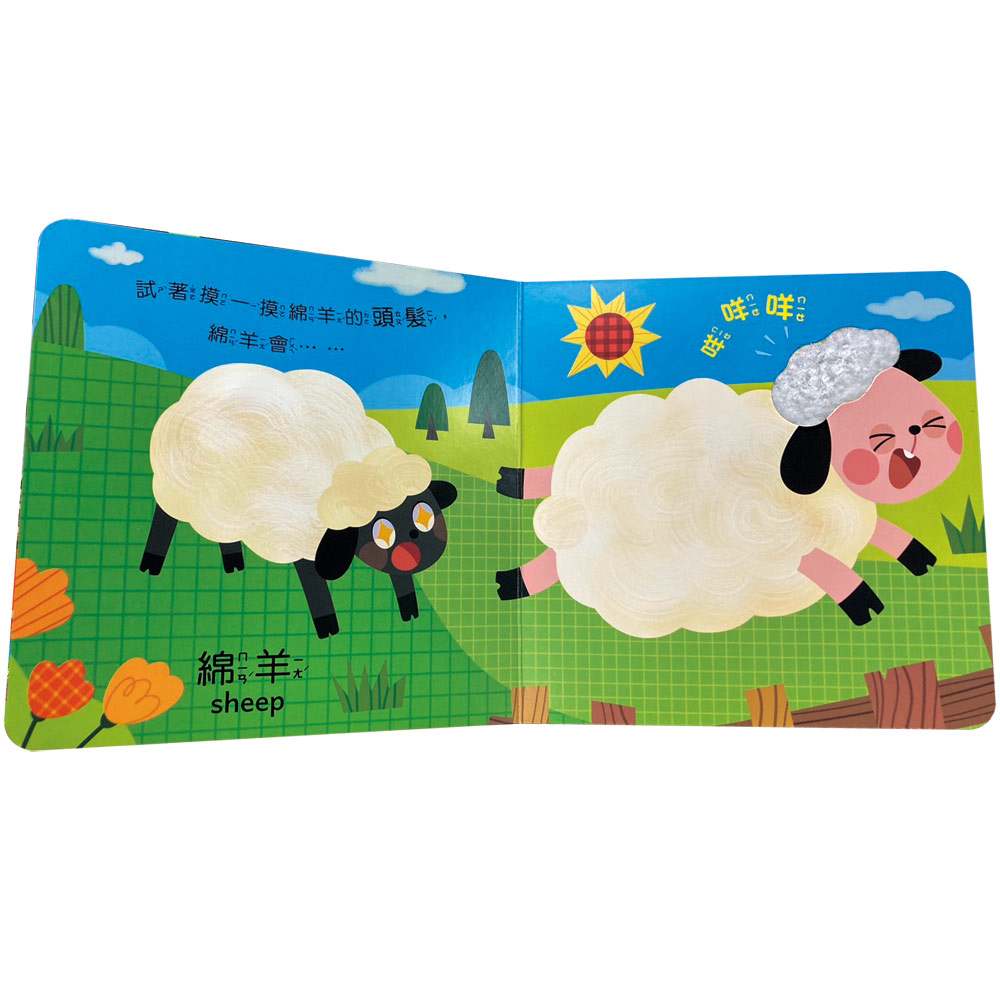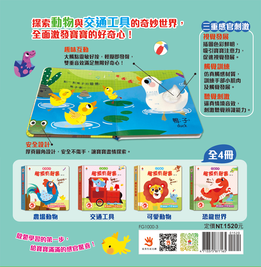 👀視覺+👂聽覺+🤚🏻觸覺, 探索動物與交通工具的奇妙世界😍 全面激發寶寶的好奇心💡 20個絨毛材質觸摸+40種音效🔔 摸一摸,聽聽看這是什麼聲音? ★★★輕輕按壓皮毛即可發聲★★★ 咦?這是什麼聲音?👂 農場動物+交通工具+可愛動物+恐龍世界,全4冊, 你知道牠們會發出什麼聲音嗎?💁🏻♀️ 只要輕輕按壓🤗, 摸一摸仿真皮毛, 對他們搔搔癢, 就會聽到20種栩栩如生的聲音🔔 再摸一摸,還可以聽見20種趣味對話! 帶孩子認識各種動物、交通工具、恐龍的同時, 還能學會他們的英文單字哦! 貼心圓角加厚材質設計,耐撕、安全不傷手。 觸點大,反應靈敏,輕按即可發聲。 視覺+聽覺+觸覺,刺激寶寶的感官發展! 三重感官刺激,啟蒙學習的第一步, 給寶寶滿滿的感官驚喜‼️ ✦【觸覺訓練】仿真觸感材質,訓練手部小肌肉及觸覺發展。 ✦【聽覺刺激】逼真情境音效,刺激聽覺辨識能力。 ✦【視覺發展】色彩鮮明的可愛插圖,吸引寶寶注意力,促進視覺發展。 ✦【趣味互動】大觸點靈敏好按,輕壓即發聲,雙重音效滿足無限好奇心! ✦【安全設計】厚頁圓角設計,安全不傷手,讓寶寶盡情探索。 🔆內附指定電池🔋﹙鈕扣電池LR1130三顆﹚。 📚本書特色📚 ✅仿真絨毛材質,刺激觸覺發展。 ✅高音質雙重音效,吸引注意力! ✅觸點大反應靈敏,輕按即發聲。 ✅可愛插圖,促進視覺發展。 ✅厚頁圓角設計,安全不傷手。