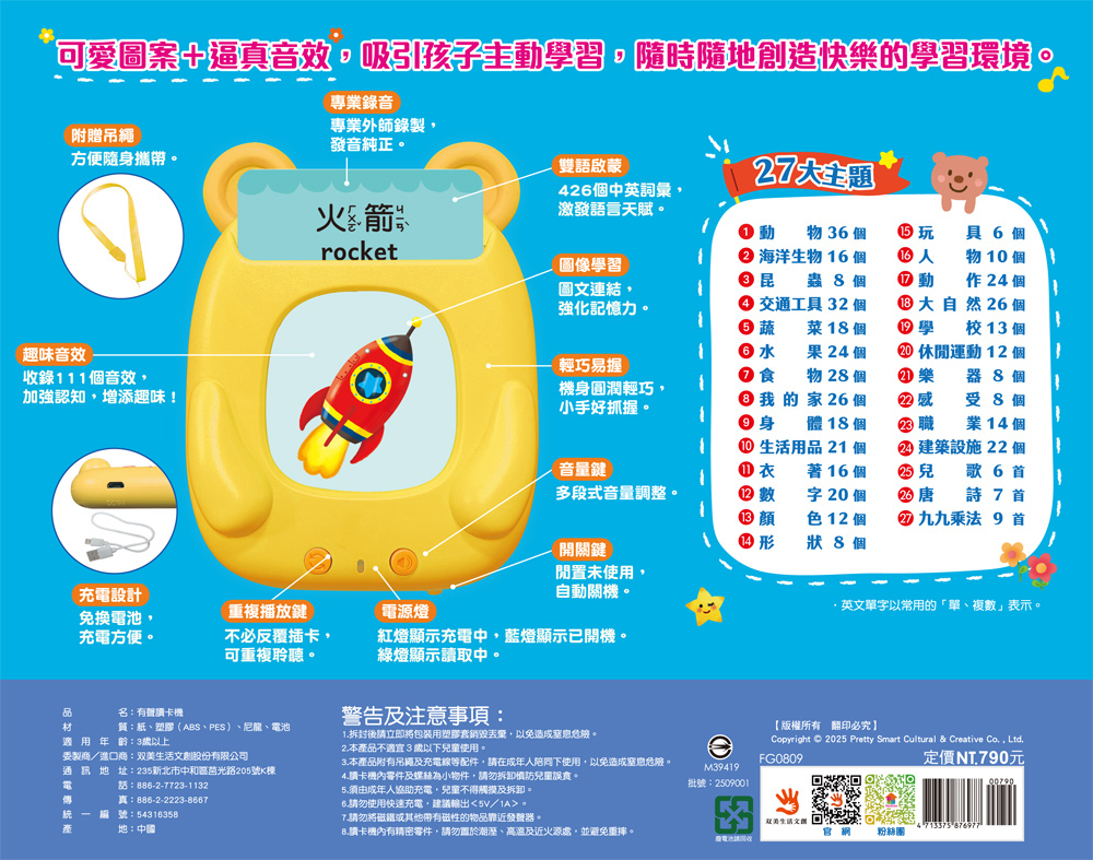 雙語啟蒙X多元學習X隨插隨讀 ★ 27個主題+426個單字+6首兒歌+7首唐詩+九九乘法 ★ ★內容物: 寶貝熊讀卡機+224張雙面圖卡+吊繩+充電線。 亮點1:多元主題認知 收錄27大生活常見、常用主題,如:動物、海洋生物、昆蟲、交通工具、蔬菜、水果、食物、我的家、身體、生活用品、衣著、數字、顏色、形狀、玩具、人物、動作、大自然、學校、休閒運動、樂器、感受、職業、建築設施、兒歌、唐詩、九九乘法等,符合兒童學習認知需求。 亮點2:雙語啟蒙、臺灣專業發音 224張雙面字卡,內含426個中英文單字(含注音),可愛插圖搭配音效,圖文連結幫助記憶,還有6首雙語兒歌、7首經典唐詩、數學九九乘法,邊唸邊唱、增添學習趣味。 亮點3:機身輕巧好攜,附吊繩 機身圓潤輕巧,長寬約11.5×9cm,重量約80g,即使幼兒小手也好抓握,附贈吊繩方便外出攜帶,隨時隨地都能學習。 亮點4:按鍵功能簡單,好操作 (1) 重複播放鍵-放入字卡後,只需再按一下,即可重複播放聆聽、訓練聽力。 (2) 音量調整鍵-多段式音量設計,按下音量鍵,即可依所在環境調整音量大小聲。 亮點5:免電池、充電設計 不須裝電池,附有充電線,機器耗電量低,環保又節能。 ◎提醒:建議輸出<5V/1A>,請勿使用快充、避免機器耗損!第一次使用時,可先進行充電。 亮點6:節電模式,自動關機 當機器閒置未使用時,會發出提示音吸引兒童操作,若仍未使用,則會自動關機,節約電源,若需繼續操作,關上開關後,再次打開即可使用。 本書特色 ★中英雙語啟蒙,激發語言能力。 ★可愛插圖搭配音效,加深學習印象。 ★臺灣專業錄音,中外師發音純正。 ★機身輕巧,附吊繩,方便外出攜帶。 ★多段式音量,可依使用環境調整。 ★免換電池,附充電線,充電方便。 ★節電設計,閒置未使用會自動關機。 ✽適用年齡:3歲以上