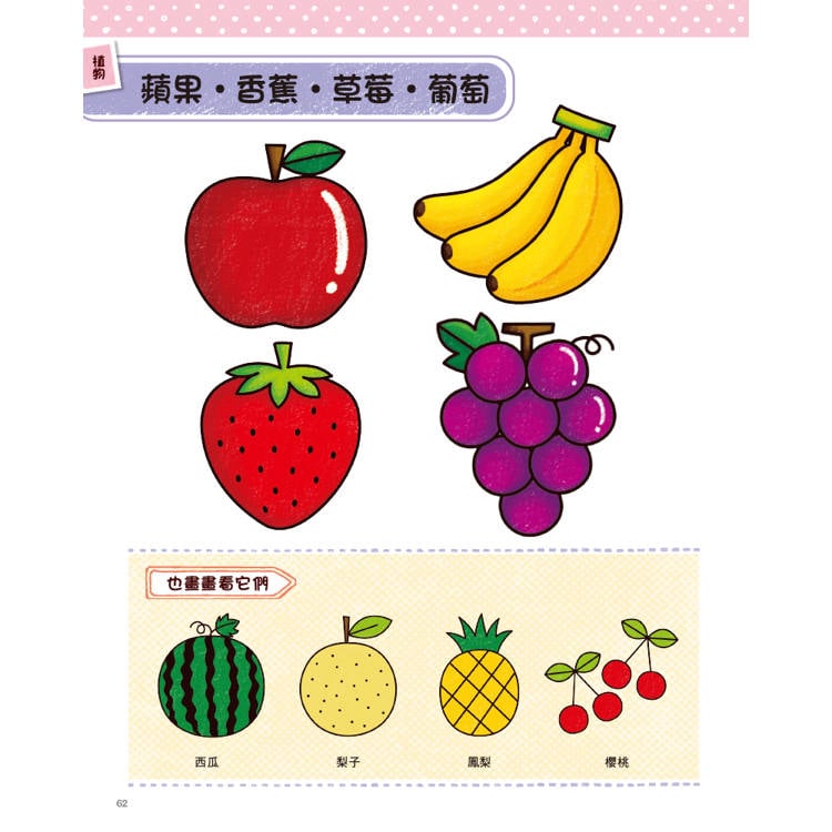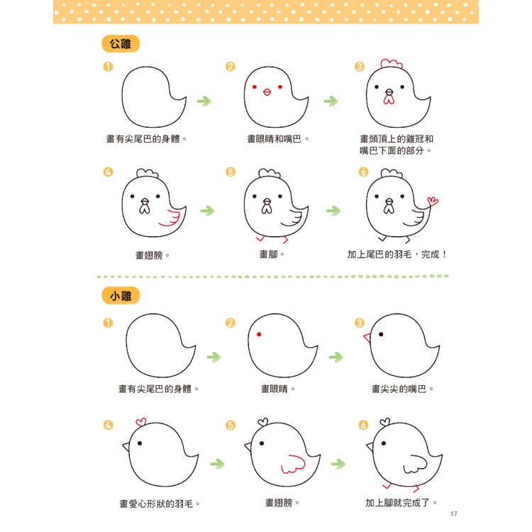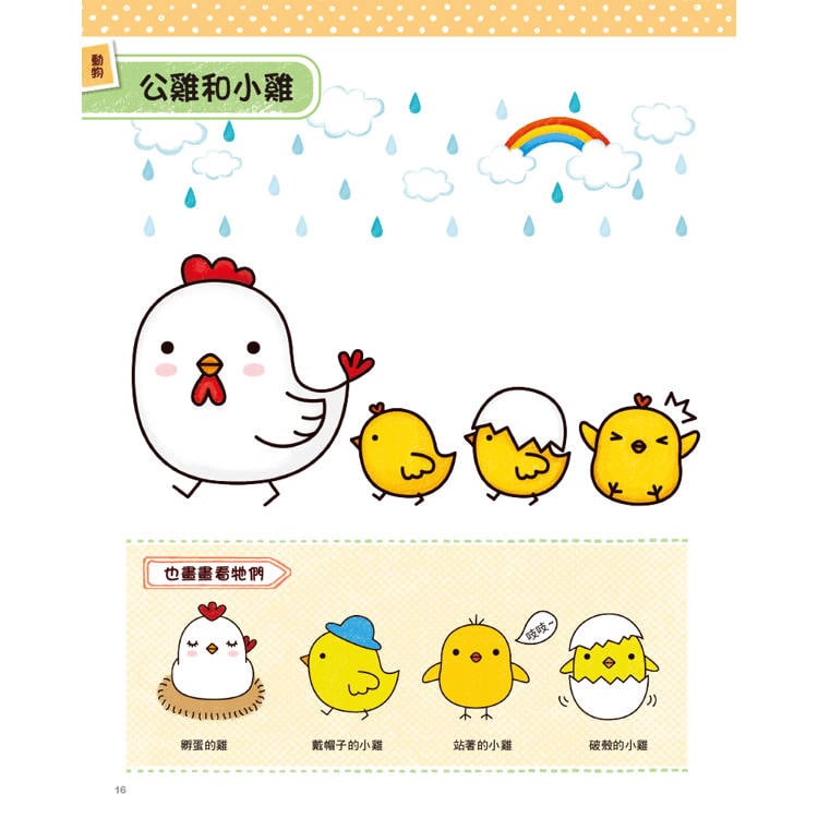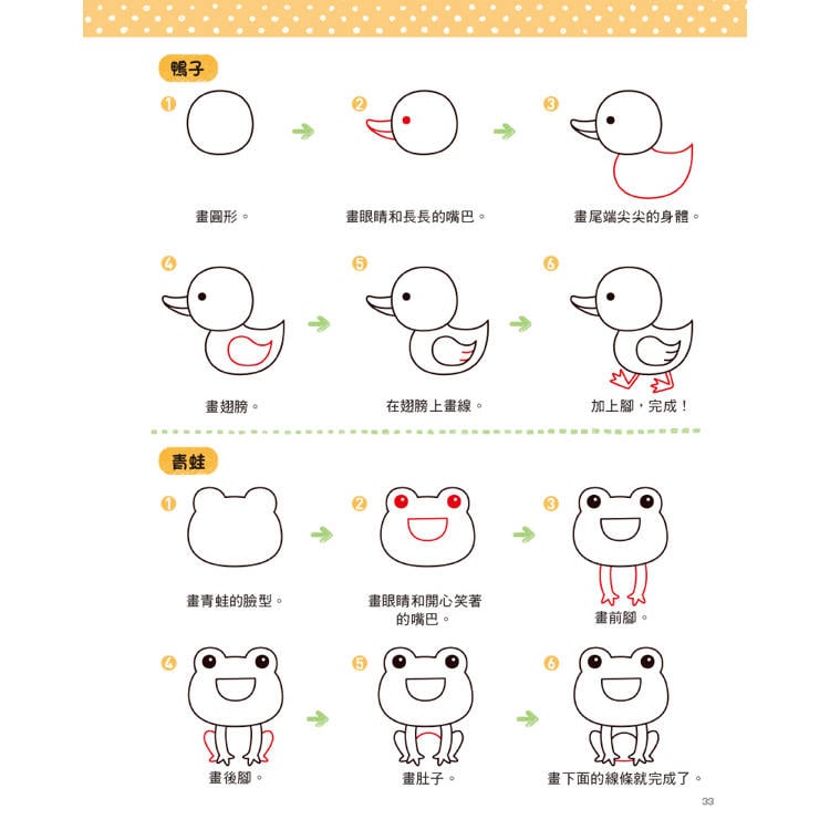 風靡韓國媽咪圈!知名網路書店yes24突破35週暢銷排行★★★★★5顆星畫畫書 在台暢銷突破11,000本,人氣好評,作者特別加量版 不知怎麼開始畫畫的孩子和爸媽的救星! 實在太可愛,就怕小孩搶著要! 各種角色、動物、植物、昆蟲、物品、交通工具… 小狗、小貓、海豚、螢火蟲、聖誕老公公、蘋果、小木偶… 還有更多小朋友想畫的圖畫,但是不知道該怎麼畫出來嗎? ‧請翻開本書,每個“新增步驟”都用“紅色”標示, 就算不看文字說明也能輕鬆跟著畫。 ‧只要用“圓形”、“三角形”、“四方形”, 再加上幾個“直線”和“曲線”的圖案, 再複雜的圖畫也能畫好。 ‧還可以用彩色筆、蠟筆或色鉛筆“著色”, 完成屬於自己的圖畫,培養創造力。 另外,從原本的圖案中還能跟著再畫出更多不同的圖案, 現在就讓小朋友開始進入快樂的畫畫世界吧! 這是從幼兒到小學生都能經常翻閱的一本繪畫書 學習領域:藝術 適讀年齡:6歲以上 註:4~6歲可練習依步驟圖繪畫