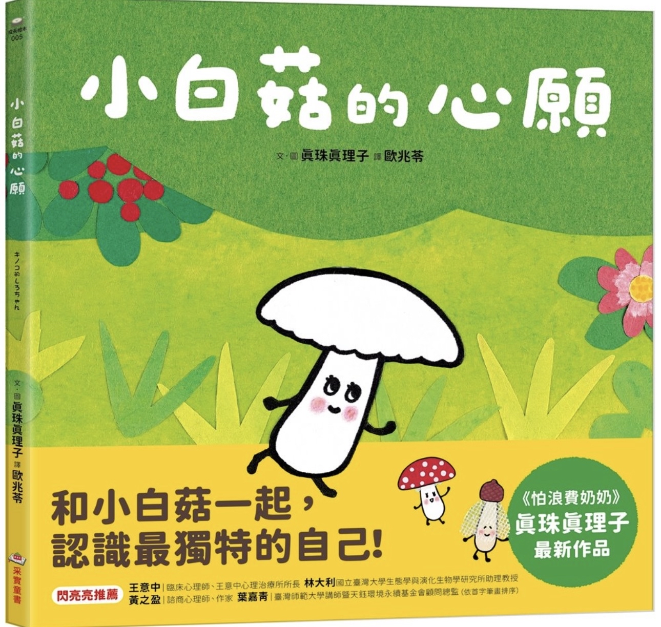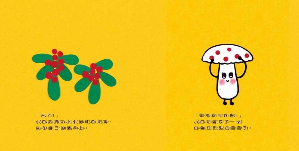 小白菇的心願 內容簡介 ──《怕浪費奶奶》作者真珠真理子,全新創作繪本── 嘿!你知道嗎,總是羨慕別人的你, 其實也很有魅力喔! 一身潔白的小白菇,很羨慕別人身上所擁有的特點。 他羨慕「圓點菇」身上有可愛的圓點, 於是他摘下圓圓的果實,裝飾在自己身上; 他羨慕「小花菇」像花朵般美麗, 於是他摘下了花朵,裝飾在自己身上…… 身上裝點了許多裝飾品的小白菇, 開心的前往廣場,參加菇菇村慶典。 在一陣旋轉跳舞後,小白菇身上的裝飾品都被甩飛了, 著急的他不知該如何是好, 沒想到,大家對著他發出讚嘆的聲音…… ✦✧✦✧✦✧✦✧✦✧✦✦✧✦✧✦✧✦✧✦✧✦✦✧✦✧✦✧✦✧✦✧✦ ◆發現自己的獨特魅力 小白菇提醒了我們,每個人都是獨一無二的個體,總是把眼光關注在羨慕別人的同時,也別忘了記得欣賞自身的優點。陪伴孩子一起認識自己,建立自信吧! ◆學習欣賞與讚美別人 當其他菇菇發現小白菇的特色時,也毫不吝嗇的給予讚美,這是很值得小朋友學習的喔!從故事中幫助孩子練習欣賞與尊重他人。 ◆以真實菇類為原型的角色創作 書中登場的菇菇角色們,都是「真有其菇」,不僅讓人大開眼界,還能認識這些有趣的菇菇好朋友們。 ☆ 本書特別邀請到國立臺灣大學生態學與演化生物學研究所林大利助理教授為我們審訂各種菇菇名稱。讓孩子學習到最正確的菇菇小知識! ◆結合拼貼畫的獨特創作 作者使用拼貼畫技法繪製,將紙染色後剪貼在一起,讓畫作更加豐富有趣,小朋友也可以自己嘗試動手做做看。這是一本不只能夠共讀,還能共學、共玩的繪本! ◆ 看完故事後還可以…… 1. 帶著孩子聊聊屬於自己的獨特魅力。 2. 和孩子一起去網路查一查、到戶外找一找菇菇們真正的長相吧! 3. 與孩子一同DIY製作菇菇拼貼畫。 #自我肯定 #自我效能感 #生命教育 #SEL社會情緒學習 #欣賞尊重他人 【適讀年齡】 ▲ 適讀年齡:2~6歲親子共讀;6歲以上自己閱讀。 ▲ 文字附注音,適合親子共讀,也適合孩子自己讀。──《怕浪費奶奶》作者真珠真理子,全新創作繪本── 嘿!你知道嗎,總是羨慕別人的你, 其實也很有魅力喔!