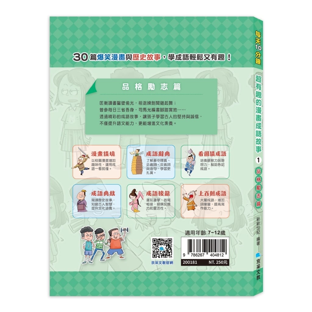 本書精選三十則與品格勵志相關的成語故事,每則成語除了有歷史典故,還附上成語解釋、近義詞、反義詞與造句,幫助孩子「懂意思、會使用、知來源」,深入了解成語背後的文化意涵。書中也設計了孩子最喜歡的「看圖猜成語」與「成語接龍」,讓學習變得更有趣。同時,每則成語都搭配一則搞笑的校園漫畫,讓孩子在歡笑中自然熟記成語。