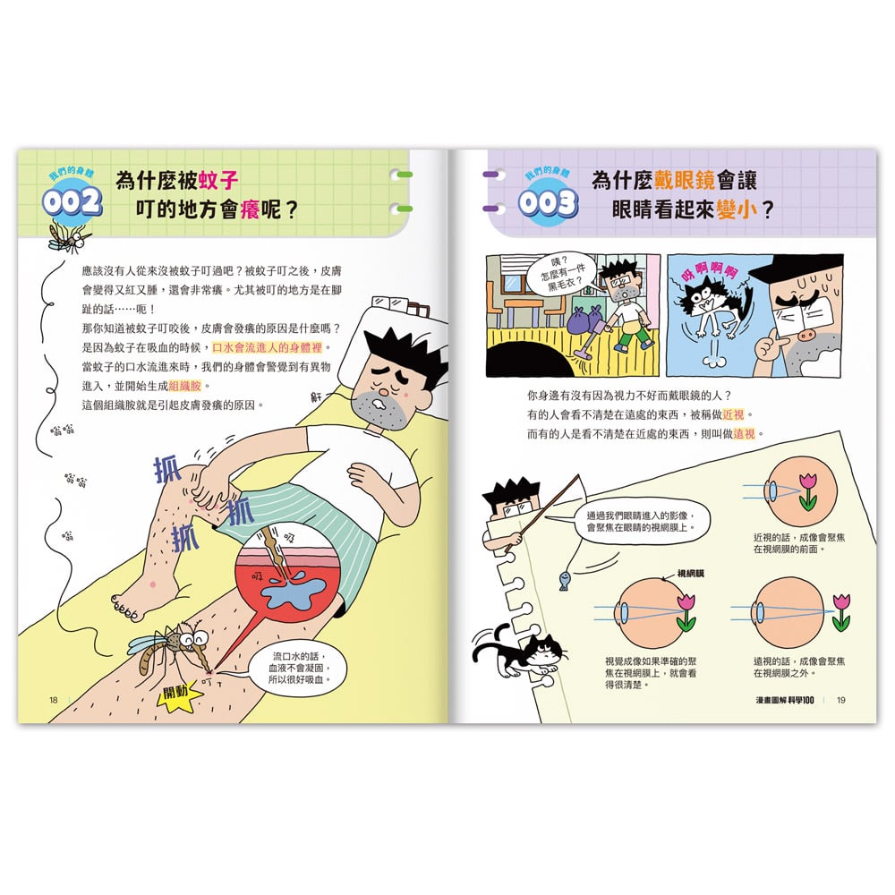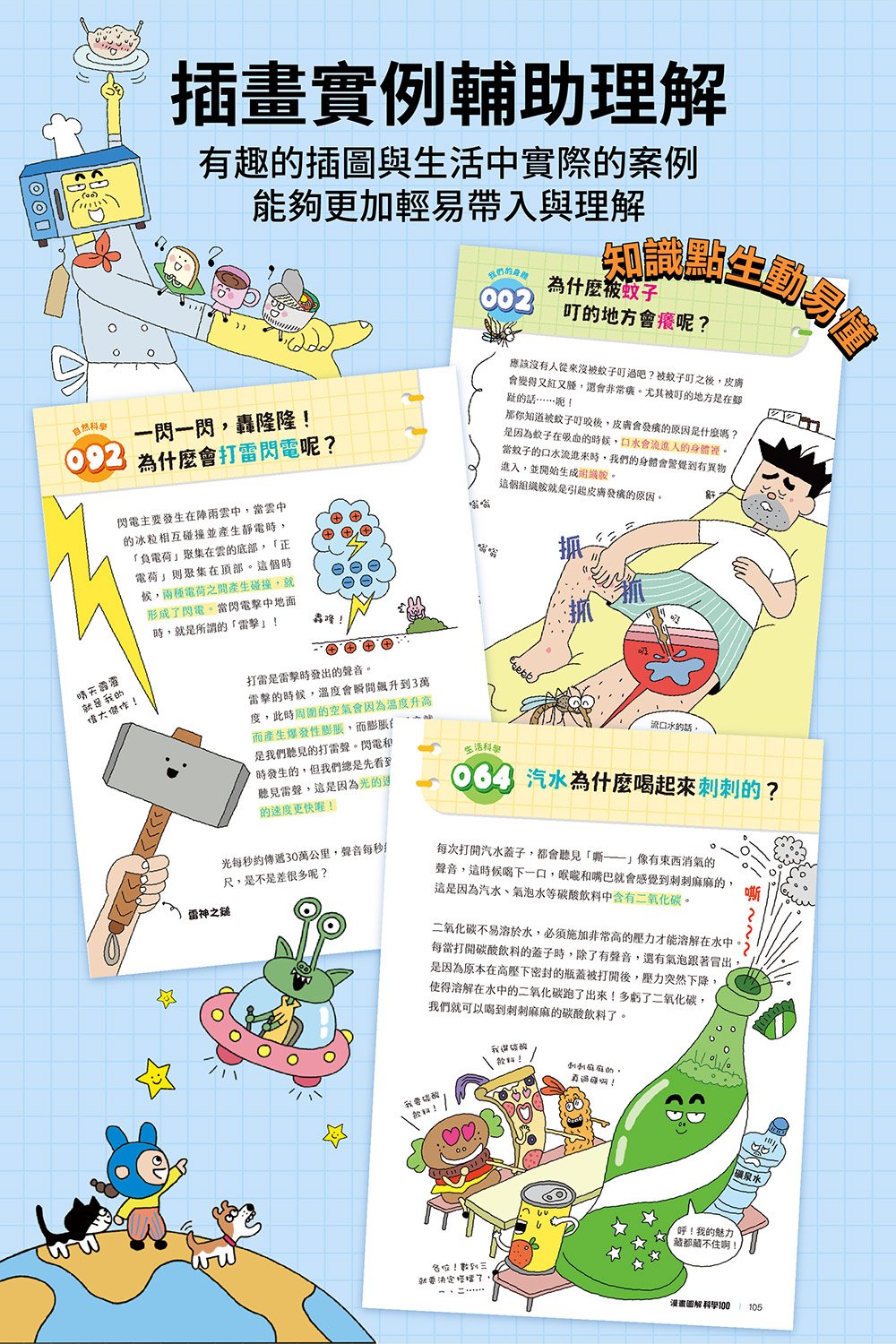 👀左看看,👀右看看,生活中有好多驚奇科學🧪,利用漫畫圖解方式說明🗣️,探索學習科普知識‼️ 「好奇心」就是科學研究的動力!左看看👀、右看看👀,仔細觀察我們的周圍,你都看見什麼呢❓一起探索《我們的身體》、《動物與植物》、《生活科學》、《自然科學》四大領域的100個故事📚當這些日常事物的疑惑得到解答後,是不是對這個世界更加好奇了呢?在充滿神奇科學知識的世界,等著大家帶著好奇心來探索、體驗‼️ 《漫畫圖解 科學100》旨在以淺顯易懂的方式,幫助孩子👦🏻👧🏻了解日常生活中的科學原理,更能激發孩子們對於科學的興趣與探索精神。📚本書精心編選100則生活中的科學小故事,與我們日常生活密切相關,希望能以有趣的漫畫吸引孩子的目光與好奇心,進一步去探索這些知識如何在生活中發揮作用,激發出無限的學習動力與創造力‼️ ✅100則科學知識 100則生活科學知識,一起解開藏在生活中的科學秘密。 ✅精選分類4大主題 包含《我們的身體》、《動物與植物》、《生活科學》、《自然科學》四大領域。 ✅漫畫圖解簡單易懂 利用漫畫形式講述生活中常遇到的狀況,並帶入科學概念,讓學習科學變得更簡單。 ✅插圖實例輔助理解 可愛又有趣的插圖與生活中實際的案例,能夠更加輕易帶入與理解。 ✅全彩插圖吸引目光 全彩插圖、生動細膩的插畫,容易視覺化理解,提升閱讀興趣。 ★主題知識輕鬆閱讀 100則主題式知識,輕鬆閱讀,學習不會有壓力。 ★科學閱讀學習 全面提升孩子生活上的科學概念,提升閱讀與學習效果。 ★快速吸收知識 知識濃縮重點,沒有艱深術語、沒有沉重學理,用最生活化的方式,帶領理解生活中的科學。 ★引發好奇心 漫畫圖解方式容易產生共鳴,引發好奇心,激發無限的學習動力與創造力。 ★親子互動關係 本書也適合家長與孩子共讀,作為自然科學教學的補充讀物。