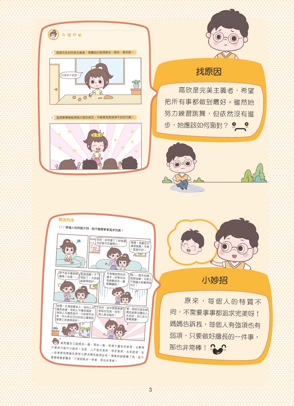 ★孩子成長路上的心靈導師★ 用漫畫故事演繹小學生的心理困擾, 學習實用小妙招,和煩惱說拜拜! 我的身體為什麼變得和以前不一樣? 考試怎麼總是考我不會的題目? 爸爸媽媽買的書我不喜歡,怎麼辦? 孩子在成長的過程中,是否經常遇到各種煩惱與挑戰?《漫畫小學生自信心理課》以15個小學生常發生的案例,列舉常見的成長問題、剖析心理原因、提出解決方法,幫助小學生了解成長過程中的心理變化,建立積極健康的心理狀態。 〈成長篇〉以生動的漫畫故事,陪伴孩子面對成長中的各種難題。透過實用的小妙招,孩子可以學會保護自己的身體隱私,坦然接納不完美的自己,逐漸變得更加獨立與自信。此外,本書還教孩子如何面對壓力與挫折,尋找自己的紓壓方式,在日常生活中勇於嘗試、樂觀成長,建立勇敢強大的內心! 本書特色 ◆了解內心世界:心理小測試列舉多項孩子常有的想法,讓孩子走進真實的內心世界。 ◆真實情境再現:漫畫還原真實生活情景,成長變化、社交煩惱一點也不陌生。 ◆解析心理原因:從小學生的心理角度剖析問題,理清思緒,找出真實的原因。 ◆提供解決方法:用漫畫故事演繹解決問題的妙招,讓方法更清晰,培養解決問題的能力。 ◆心理小知識:在輕鬆閱讀的氛圍中,學習心理效應的小知識,幫助孩子健康成長。