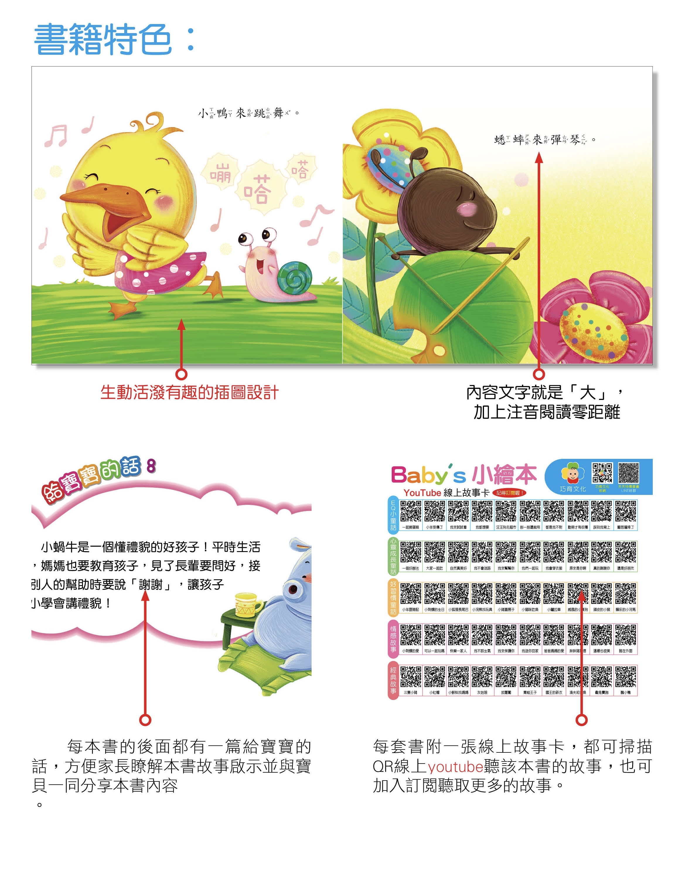 ❤️讓童話溫暖寶寶的心靈… 這是一些有助寶寶👦🏻👧🏻心靈成長的心理教育故事📚慢慢欣賞,故事中的一幅幅畫、一句句話🗣️都能讓寶寶變得越來越獨立、開朗、勇敢,這些健康美好的品質,是讓寶寶成長之路最寶貴的財富。 📚這系列繪本,非常推薦,此系列繪本共有五大主題,每一大主題裡有10本故事書+1片CD,每個主題裡有10篇小故事,內文簡短,寶寶容易吸收與學習,透過父母說故事的同時,也達到親子互動的最好時機喲... 📖繪本不僅有可愛的插圖與適合寶寶閱讀的字體大小,還雙面裱褙、防水,讓寶寶們能盡情的翻閱、閱讀,更有精彩的劇場式CD喲...👍👍 📝主題一:❤️情感故事❤️ 🧸孩子也會有高興、生氣、害怕、忌妒等情緒,可是他往往難以清楚地認識和表達出來。要學會理解寶寶,以寶寶能夠接受的方式誘導他正確認識自己的情緒變化,從而形成健康的人格,成為一個高情商的人。