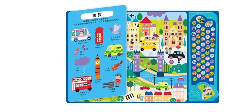 超大本音效書 X 找找書 全系列收錄超過上百種音效 橫跨歐亞非洲,節選5大城市 帶你認識50種城市裡的代表性聲音 體會異國城市的萬種風情 你聽…… 大笨鐘噹噹噹!救護車喔咿喔咿!街頭藝人奏出美妙的音樂。什麼?居然還有足球員在踢球!城市裡有好多特別的聲音,一起來找找這些聲音從哪裡發出來吧〜 5大城市、超大折頁 共有52種城市的聲音 打開折頁有豐富的場景 每個場景都有10個尋找的任務 按下按鍵聽聽看 城市裡特別的聲音吧! 本書特色 ▌精選5大城市,帶你暢遊歐亞非,發現城市之美! 本書介紹了5個風情截然不同的城市:英國倫敦、美國紐約、日本東京、摩洛哥馬拉喀什、巴西里約熱內盧。精緻彩圖街景,讓你陪著孩子用一本書環遊世界,體會豐富的異國風情! ★倫敦的聲音 大笨鐘、冰淇淋車、電話亭、救護車、紅色雙層巴士、雨、鴨子、松鼠、飛翔的鴿子、街頭藝人 ★紐約的聲音 挖土機、警車、直升機、旗幟、協力車、大黃蜂、垃圾車、計程車司機、街頭表演者、旋轉木馬 ★東京的聲音 風鈴、摺紙、寺廟、行人穿越道、噴泉、機器人、高速鐵路、熱氣球、飛機、觀光客 ★馬拉喀什的聲音 蛇、馬、猴子、雞、駱駝、驢子、貓、電動自行車、車子、朋友聚餐 ★里約熱內盧的聲音 鼓手、足球選手、鸚鵡、螃蟹、海鷗、狗、海豚、風箏、水上摩托車、足球迷 ▌一次聆聽超過50種聲音,超滿足! 你有注意過行人穿越道的聲音嗎?你仔細聽過垃圾車的聲音嗎?你知道倫敦的紅色雙層巴士駛過街道時會發出隆隆隆的聲音嗎?本書收錄52個城市裡的聲音,從日常熟悉的汽車、道路聲,到異國城市裡獨有的特色音效,一應俱全。按下音效鍵即可清楚地聆聽風情萬種的多樣聲音,彷彿「聲」歷其境,一起來享受這場聽覺的饗宴吧! ▌邊聽邊找,打開折頁尋找樂無窮! 本書不只是音效書,也結合了「找找看」的遊戲!先觀察每個場景的10個代表性元素,再打開折頁,從超大、超豐富的各個城市街景中找出這10個東西,不只培養小朋友的專注力、觀察力、耐心,還能學習解決問題的能力,讓孩子邊聽邊玩,樂在其中! ▌雙語對照,學習單字效果加倍 本書採中英雙語對照,讓小朋友在享受圖片與音效的同時,還能自然習得英語單字,寓教於樂,吸收效果加倍。 √ 使用色彩鮮豔的圖案,刺激視覺發展 √ 採用堅固耐翻、不易撕破厚紙板材質 √ 貼心的圓角設計,不怕被邊角割傷手(使用上仍請注意安全) √ 高音質播放器,創造高品質的音效書 √ 超大開本,享受美好的閱讀體驗 *適讀年齡:3歲以上