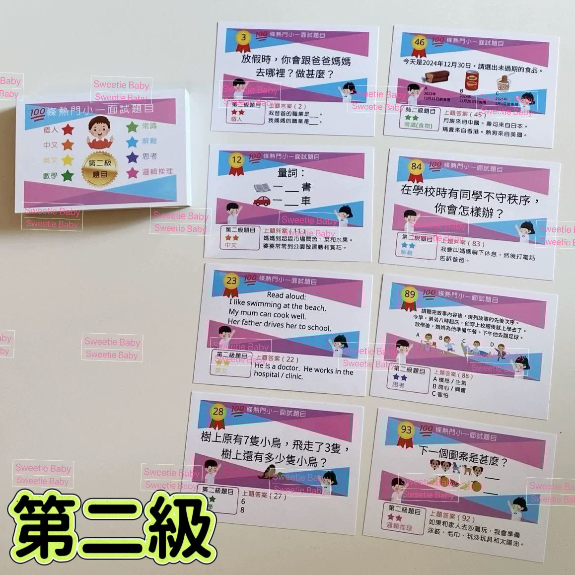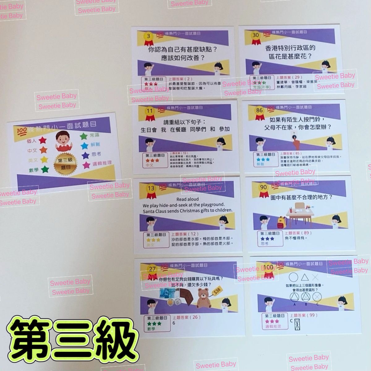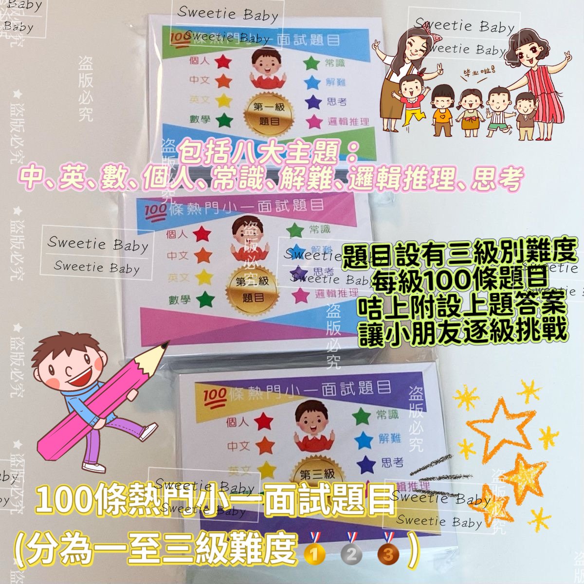 👑100條熱門小一面試題目(分為一至三級難度🥇🥈🥉) 小一面試殺到來⛷️,家長點樣能在短時間⏰訓練小朋友「對話如流+樣樣皆能」🤓? 🔥「100條熱門小一面試題目」咭,小朋友唔駛上面試班🙅🏻♀️,都能輕鬆裝備各科知識💡,自信對答👧🏻﹗ 🌟產品特色: 📍參考多間直資/私小過往面試題目,題目範疇全面,題型多變 📍包括八大主題:中、英、數、個人、常識、解難、邏輯推理、思考 📍100%香港通識教材,內容與時並進 📍題目設有三級別難度,每級100條題目,咭上附設上題答案,讓小朋友逐級挑戰 🎁設計精美能提昇小朋友學習興趣 🌟教材運用TIPS: 💁🏻♀️家長可每日用15分鐘⏱️訓練小朋友回答10條題目,一個月後必能加強自信及知識! 🌈適合K1-K3學生,建議K1學生開始有關訓練,愈早愈好! 🌟產品價錢: A: 第一級100條熱門小一面試題目咭 $168 B: 第二級100條熱門小一面試題目咭 $168 C: 第三級100條熱門小一面試題目咭$168 💫優惠套裝: 全套三級熱門小一面試題目咭 $448