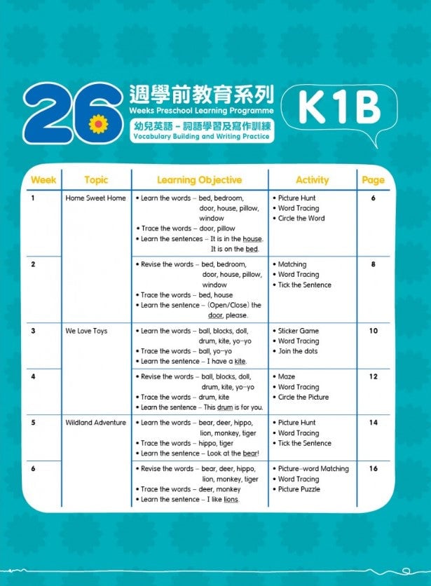 重點推介: 《26週學前教育系列 幼兒英語—詞語學習及寫作訓練》 程度適合K1-K3小朋友,分K1A/B、K2A/B及K3A/B,共6冊 全系列涵蓋小學一年級必學400個英文生字 主題式詞彙學習,緊貼學校課程 提供多元化詞彙遊戲、語文運用、寫字訓練及句式學習 編排銜接小一課程,為幼兒升小學作最佳準備 彩色練習,配以插圖,富有趣味性
