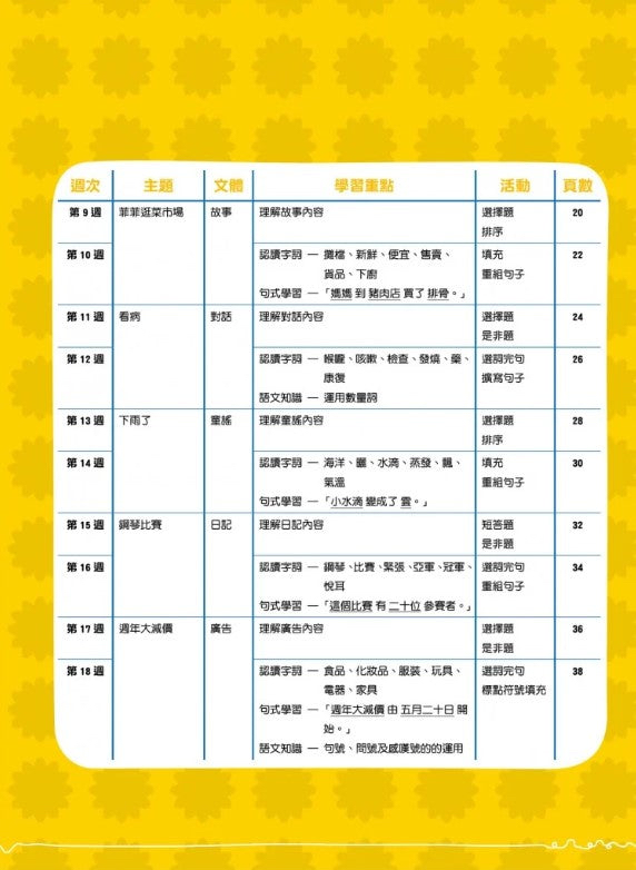 重點推介﹕ 主題圍繞日常生活,內容富趣味性,提升幼兒學習興趣 (K1A/B) – 包括不同文體,包括故事、日記、童謠、海報及通告等閱讀理解篇章 (K2AB-K3A/B) – 設有詞語運用及識字活動,建立幼兒語文運用能力 – 設有句式學習,有系統地訓練幼兒認識句子結構,打好閱讀及寫作基礎 – 提供多元化題型如配對、選擇、是非及填充題等 – 編排涵接小學課程,為幼兒升小學作最佳嘅準備 – 彩色練習,配以插圖,富有趣味性