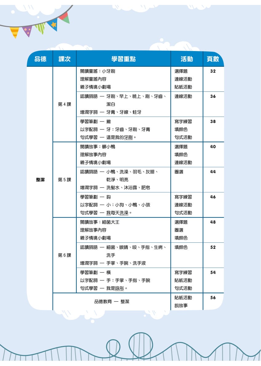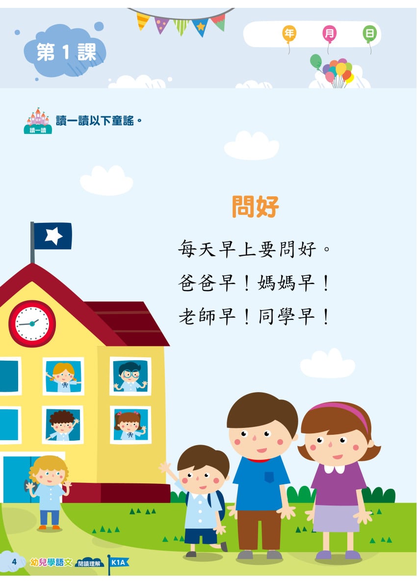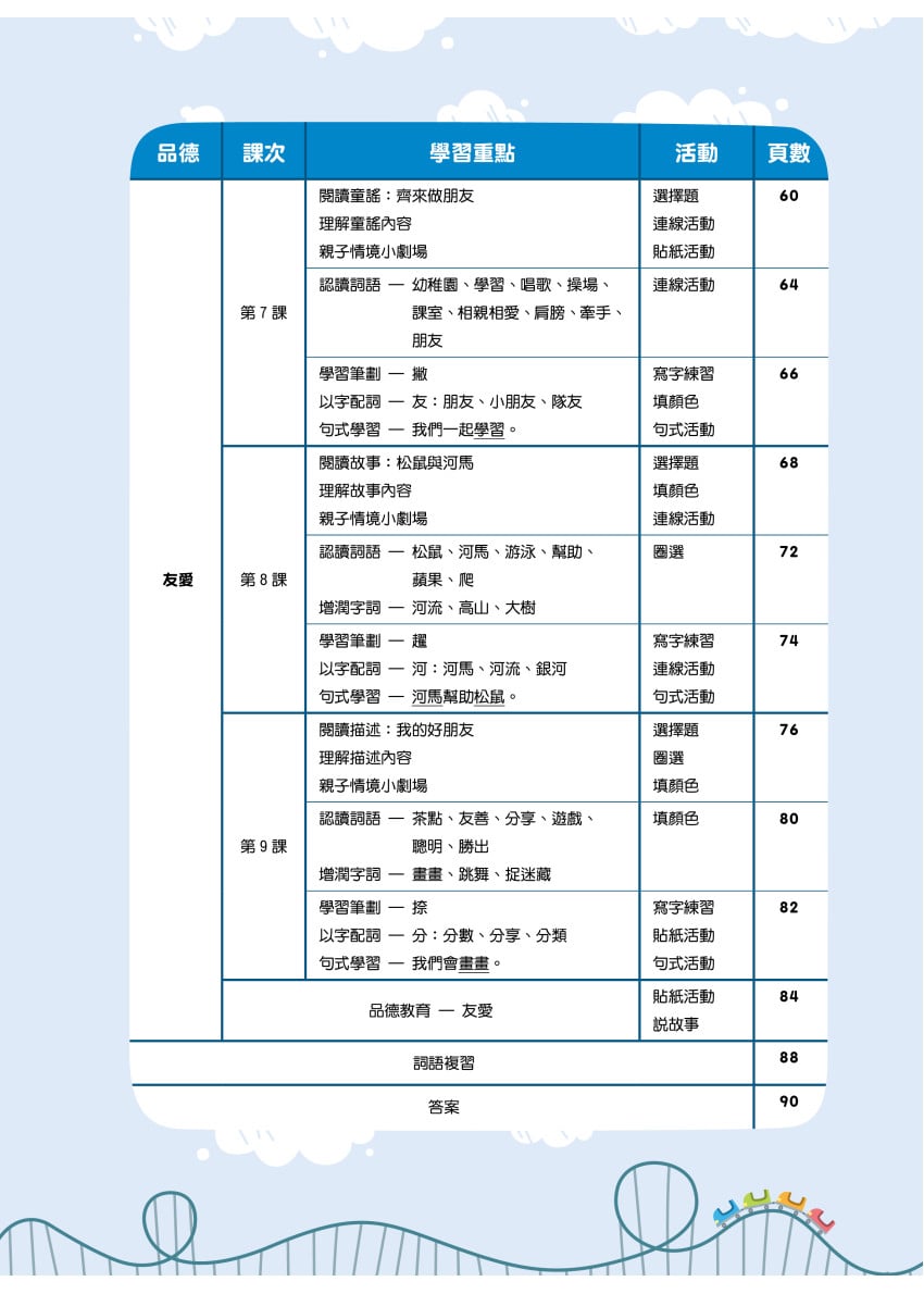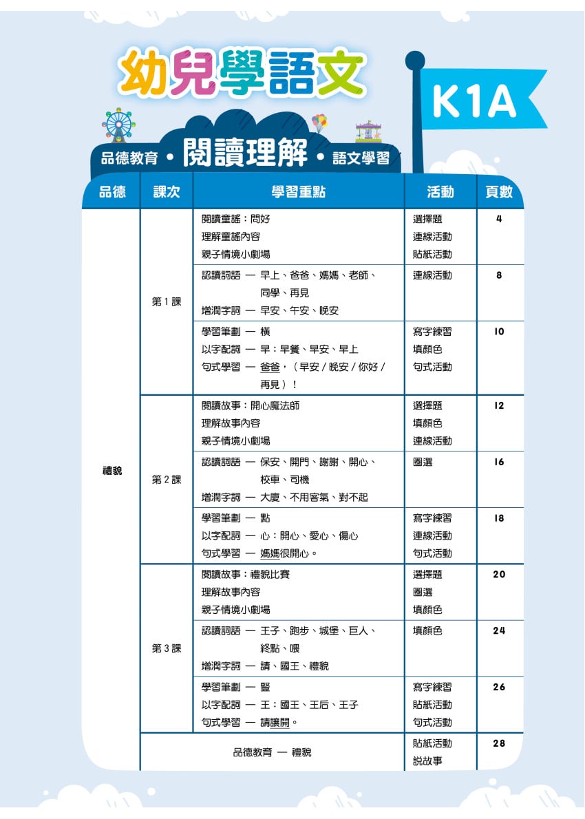 《幼兒學語文:品德教育‧閱讀理解‧語文學習》 冊次:K1A/B,共2冊 系列介紹: 「過繪本閲讀理解,學習語文知識,培養幼兒優良品格」 良好的品德和價值觀對幼兒成長十分重要。良好的道德觀念能夠幫助幼兒在未 來的學習和生活中建立良好的人際關係,培養他們成為有責任感的社會公民。 透過九個既有趣又有意味的單元,幼兒不僅能提高閲讀及理解能力,還能認識 到不同品德的重要性,學會如何在日常生活中做出正確的選擇。每個單元設有 閲讀理解,文體包括童謠、故事等,培養幼兒閲讀及解題能力,並設有詞語活 動、寫字活動及句式活動,全面提升幼兒語文能力,令幼兒成為品學兼優的好 孩子。